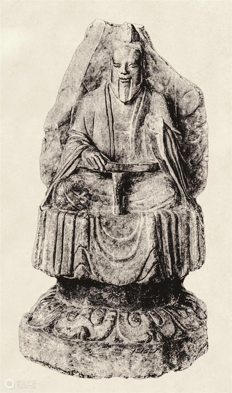 结跏趺坐于高基座上,身后背光残损。和常见的道教造像一样,身穿长袍,高发髻,山羊胡。