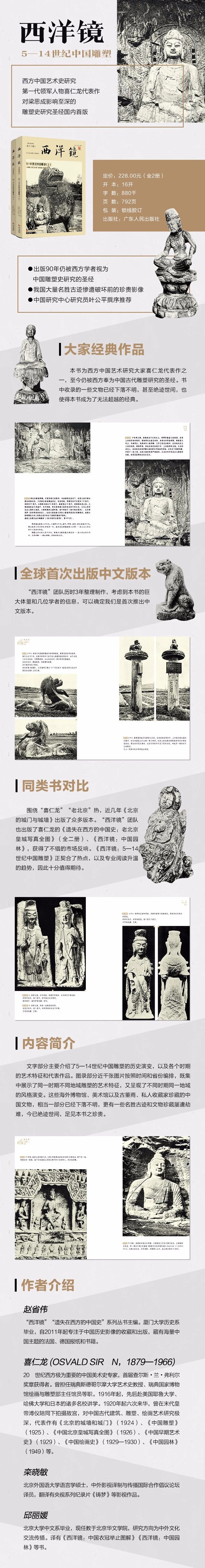 《西洋镜:5—14世纪中国雕塑》一书中展示了我国大量名胜古迹惨遭破坏前的珍贵影像。这本书初版于1925年,为西方中国艺术史研究巨擘喜仁龙的名作,直至今天仍被西方学者奉为研究中国古代雕塑的“圣经”。这部作品对梁思成影响至深。梁思成在《中国雕塑史》一书中提到: