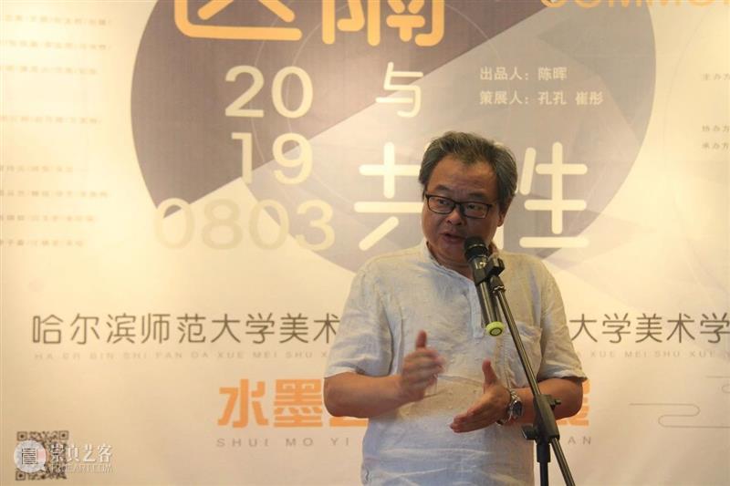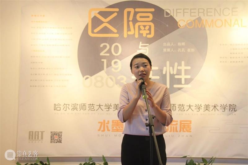 下午4点半,开幕式正式开始。本次展览联合策展人之一,著名水墨艺术家崔彤老师首先代表哈尔滨方面就本次展览的促成及筹备过程做开场发言,并对母校哈尔滨师范大学美术学院、上海师范大学美术学院、联合策展人之一孔孔女士以及美博美术馆表达了感谢。