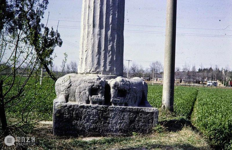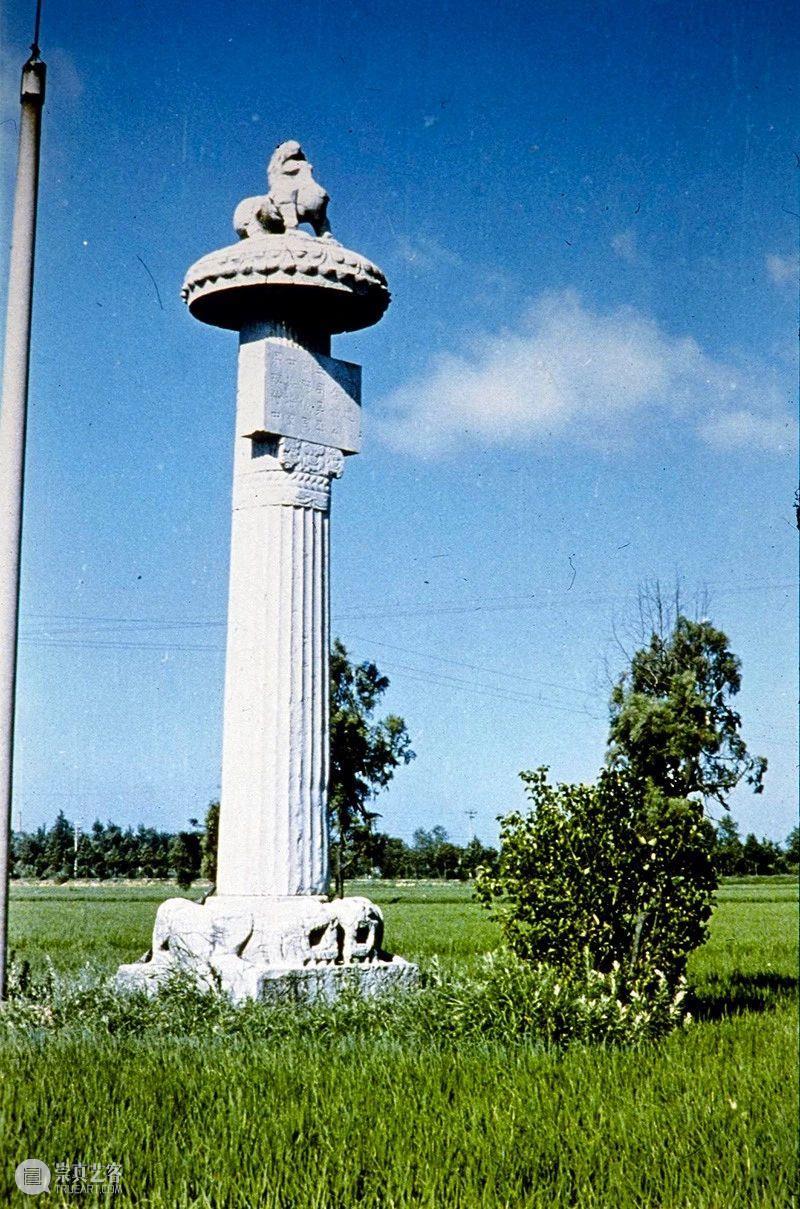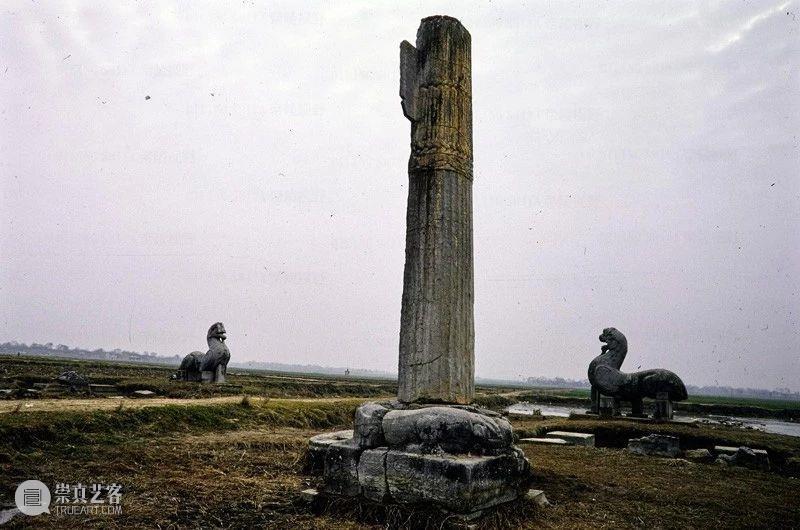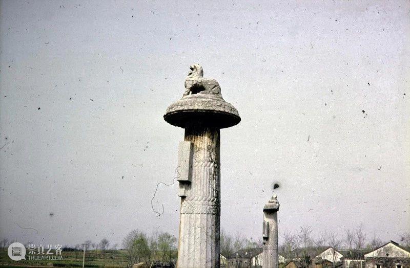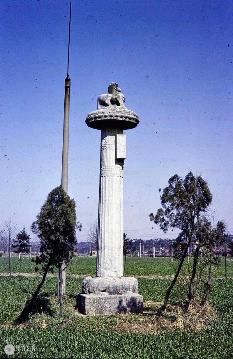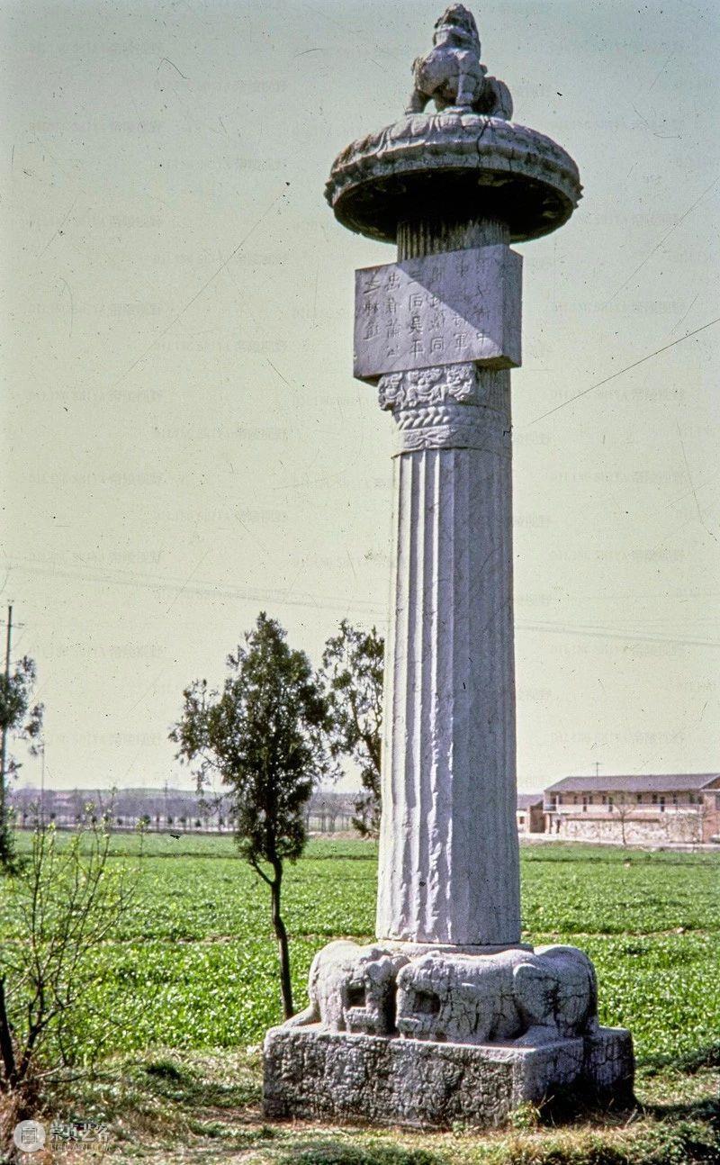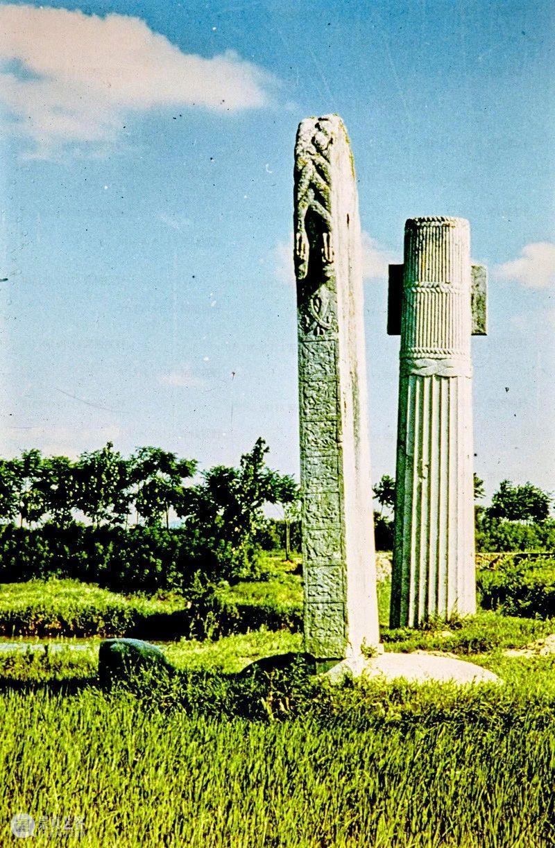 Photographic slide depicting a stele and column, Southern Liang dynasty (502 - 557 AD), Southern Dynasties (420 - 589 AD), Royal Tombs, Tomb of Xiao Hong, Nanjing, Jiangsu Province, China, 1983, from the Ann Paludan Photographic Archive of Chinese Sculpture.