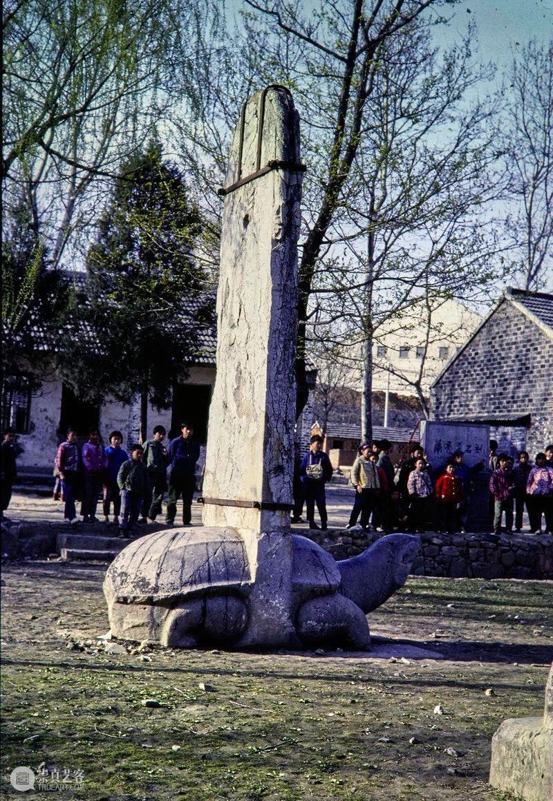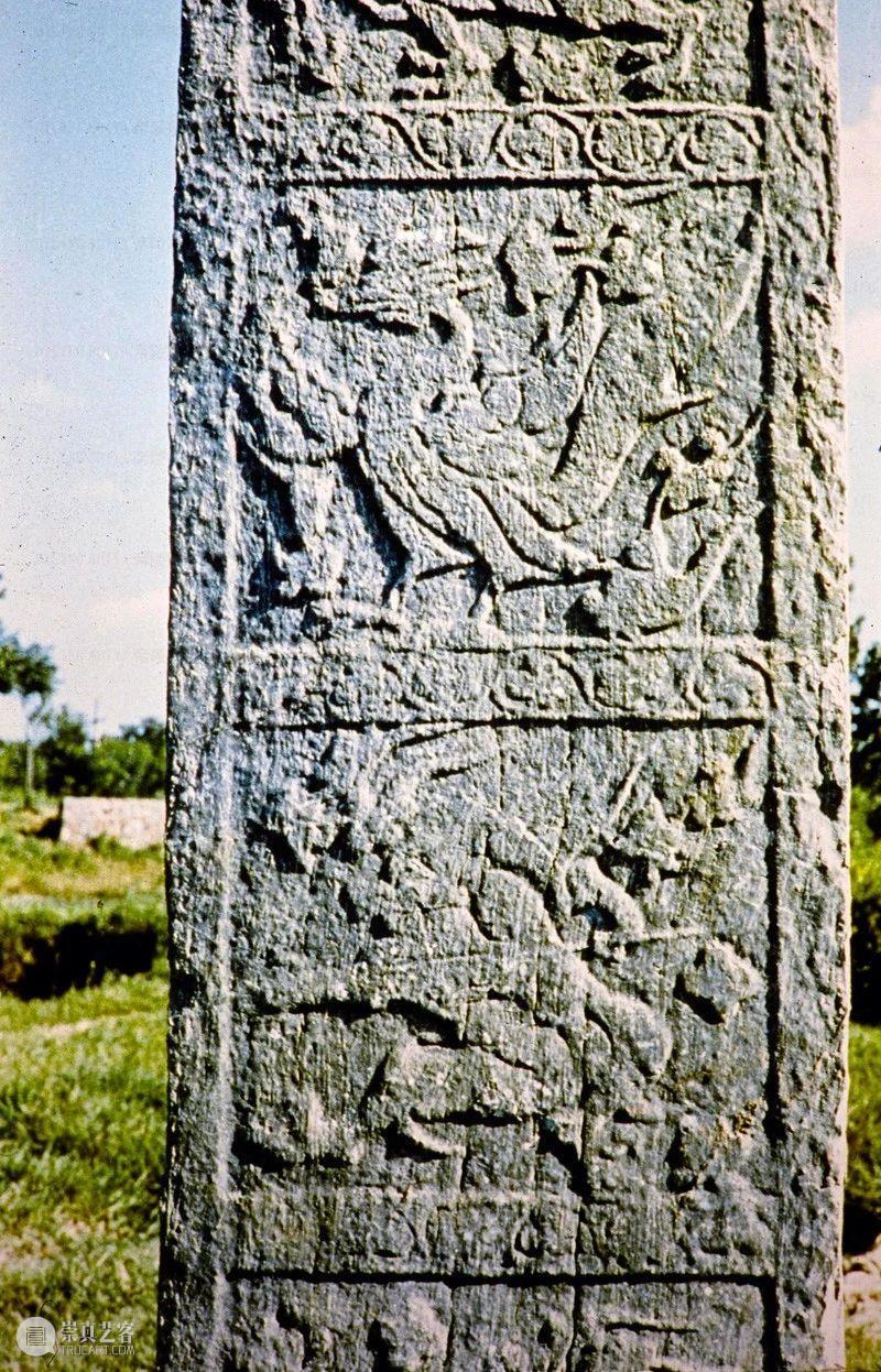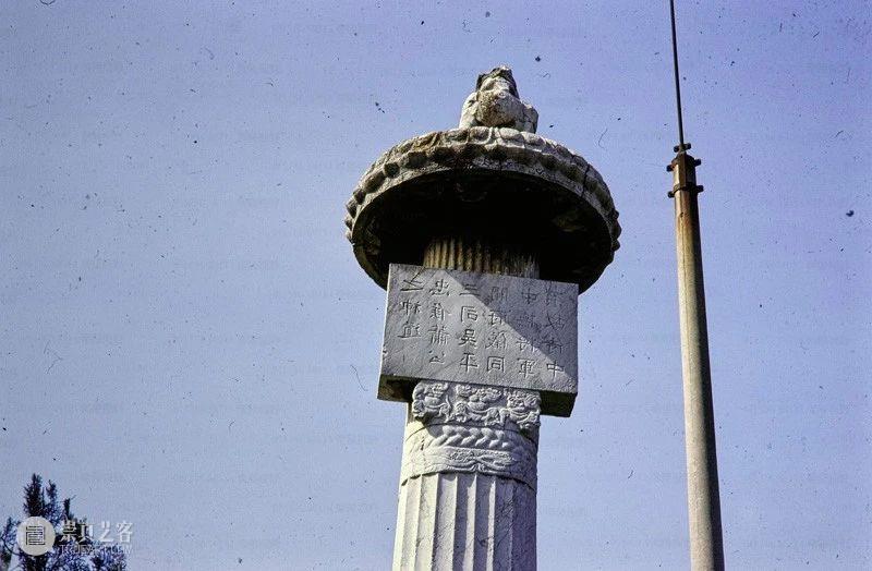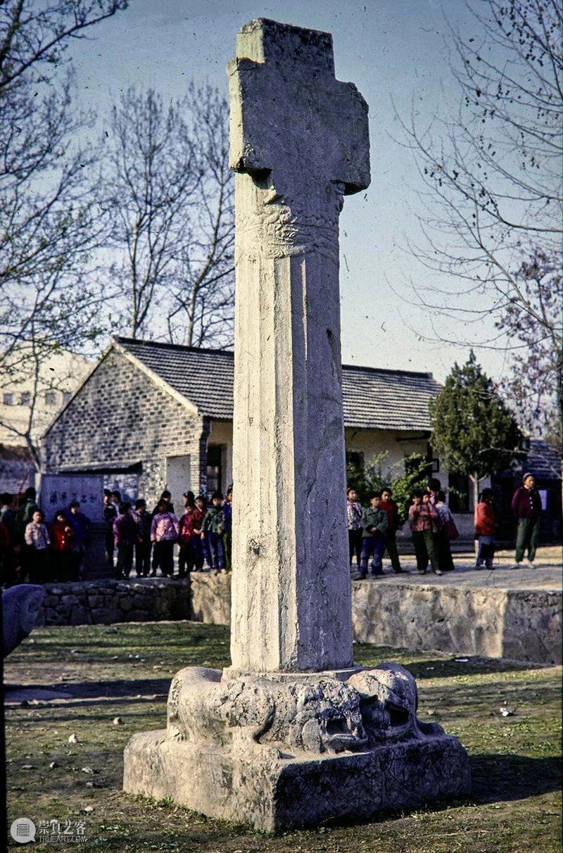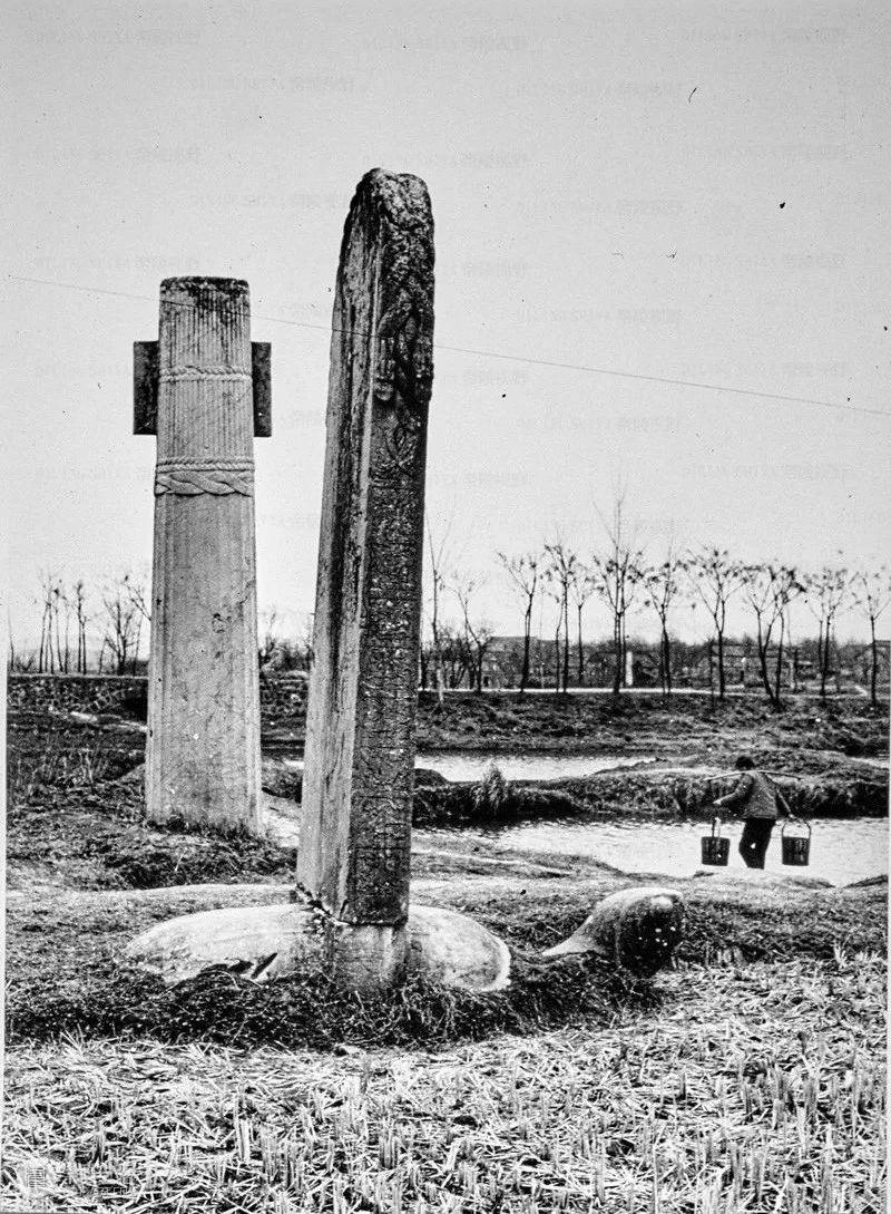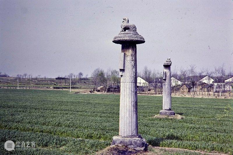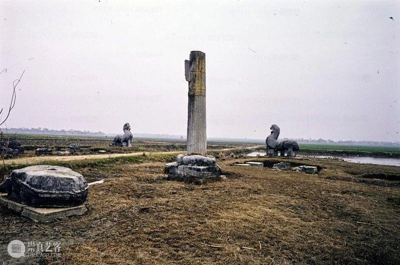 Photographic slide depicting a stele and column, Southern Liang dynasty (502 - 557 AD), Southern Dynasties (420 - 589 AD), Royal Tombs, Tomb of Xiao Hong, Nanjing, Jiangsu Province, China, 1983, from the Ann Paludan Photographic Archive of Chinese Sculpture.