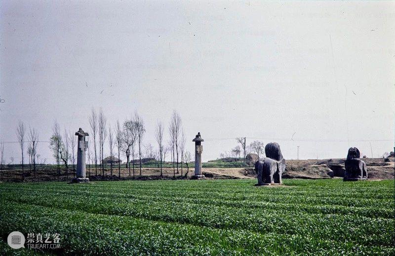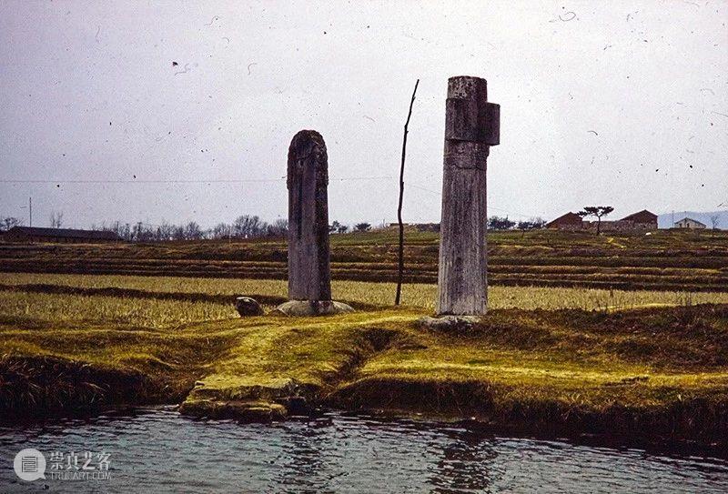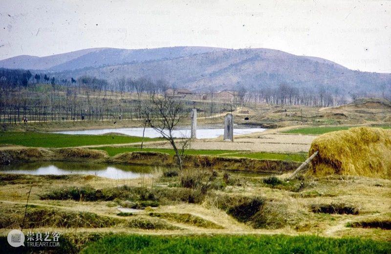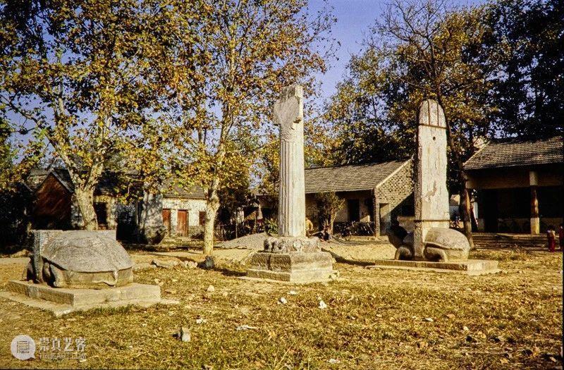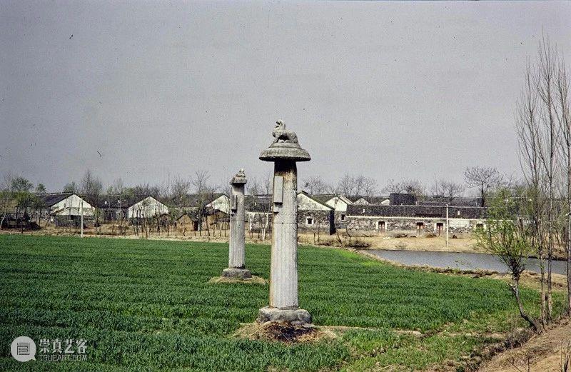 Photographic slide depicting general view with steles, Southern Liang dynasty (502 - 557 AD), Southern Dynasties (420 - 589 AD), Royal Tombs, Tomb of Xiao Xiu, Nanjing, Jiangsu Province, China, 1988, from the Ann Paludan Photographic Archive of Chinese Sculpture.