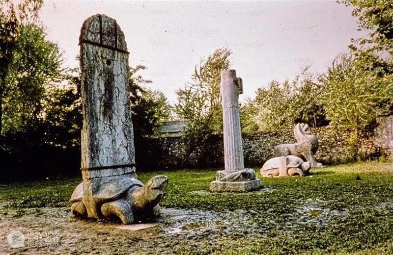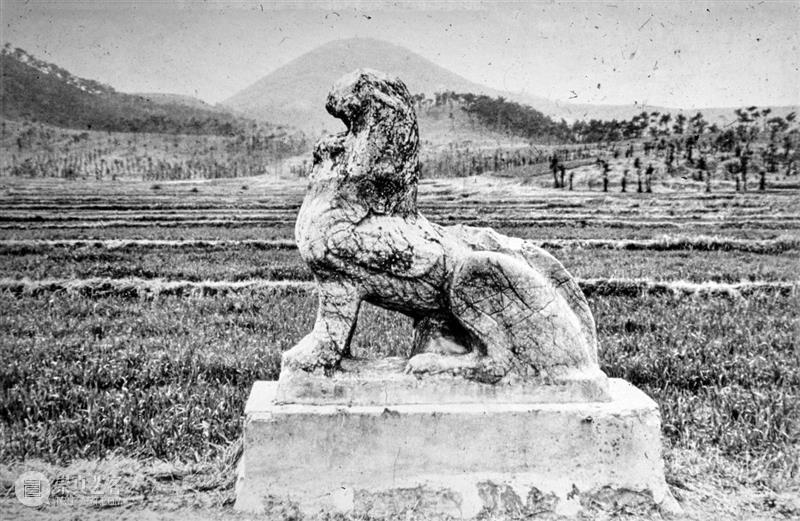 Photographic slide depicting steles and lions, Southern Liang dynasty (502 - 557 AD), Southern Dynasties (420 - 589 AD), Royal Tombs, Tomb of Xiao Ji, Nanjing, Jiangsu Province, China, from the Ann Paludan Photographic Archive of Chinese Sculpture(Date:1972 - 2010)
