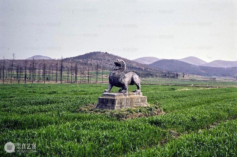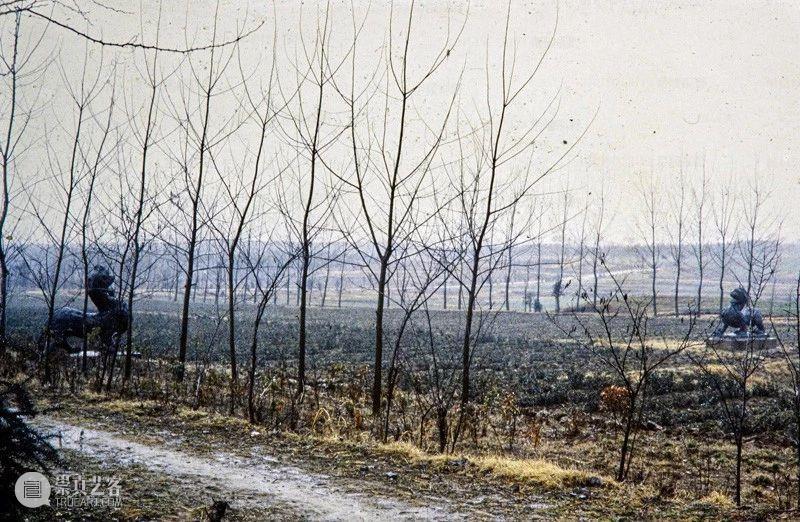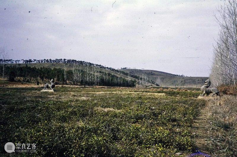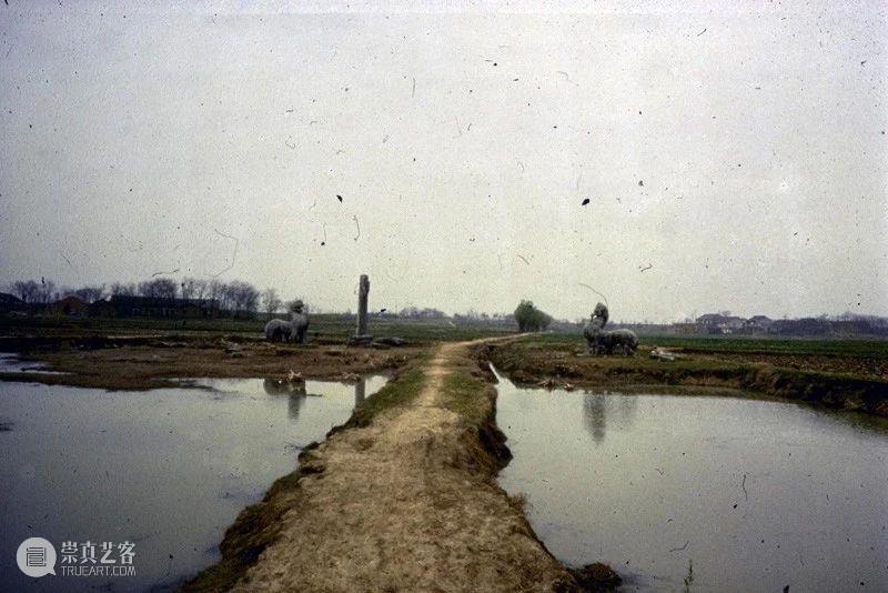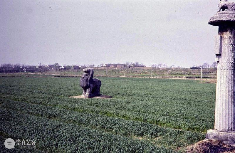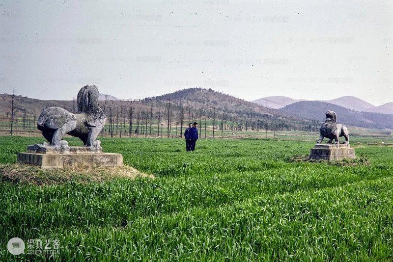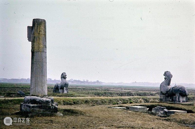 Photographic slide depicting causeway approach to Southern dynasties imperial tomb, a pair of qilin and a column, Southern Dynasties (265 - 589 AD), Liang Wendi, Jinglin, Danyang, Jiangsu, China, 1986, from the Ann Paludan Photographic Archive of Chinese Sculpture