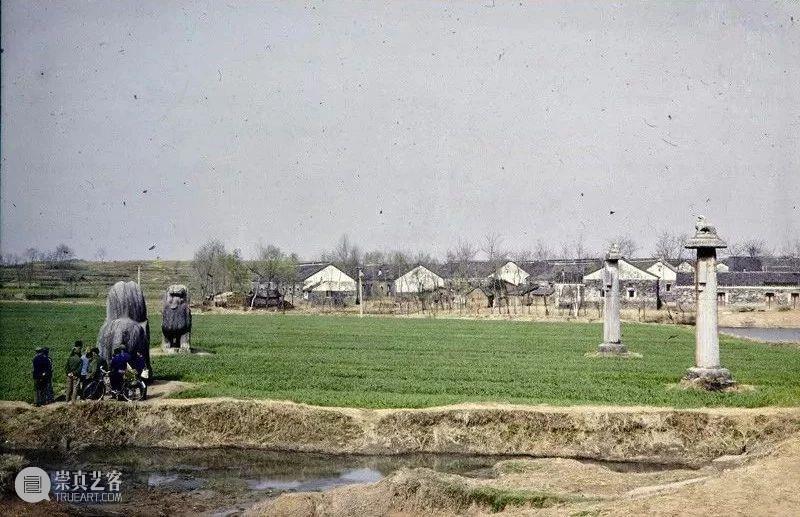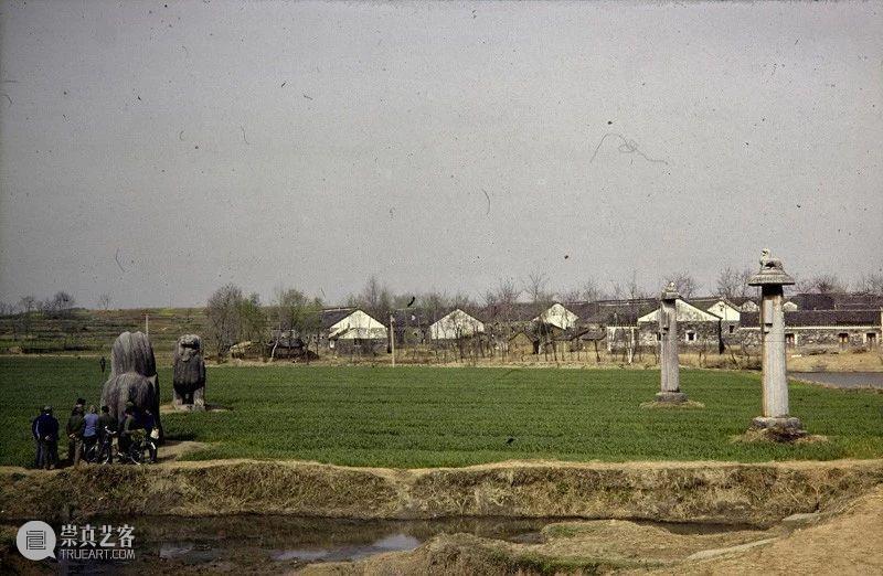 Photographic slide depicting view with people and bixie, Southern Liang dynasty (502 - 557 AD), Southern Dynasties (420 - 589 AD), Royal Tombs, Tomb of Xiao Jing, Nanjing, Jiangsu Province, China, 1988 - 1993, from the Ann Paludan Photographic Archive of Chinese Sculpture