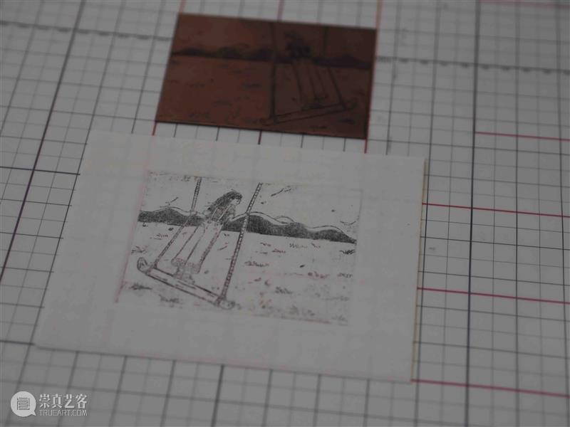 第四步:移走素描作品和复写纸,用铜版专业钢针在铜版上描刻。