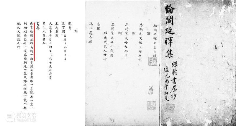 另外,曹文埴及其子曹振镛另有二书,均藏于国家图书馆,皆标为佚名《书画目录》,索书号分别为:59298、59794。因国图管理严格,扫描价格昂贵,未能得到这两本书的相关图片。该二书皆有部分内容与《石鼓砚斋书画录》相同(相同的条目在《石鼓砚斋书画录》图片中用红色*标示)。其中索书号为59298的《书画目录》,亦以“鸢”“飞”“鱼”“跃”编目,目录第一页有“乾隆五十六年八月查记”一句,可知该册的成书时间为1791年。索书号59794的《书画目录》中,记录了乾隆十二年至二十五年中(除乾隆十五年之外)历年重华宫茶宴。该书还着重记录了“御笔纶阁延晖扁一面”,而“纶阁延晖”是御赐给曹文埴子曹振镛的,曹振镛所著即名为《纶阁延晖文集》。又台湾图书馆有清道光丙午绿萝书屋抄本《纶阁延晖文集》,也非常详实记录了诸多有关御赐的情况,其中便有“御书纶阁延晖扁一面”。