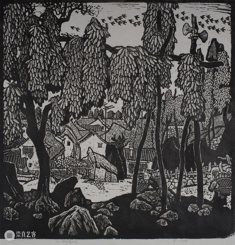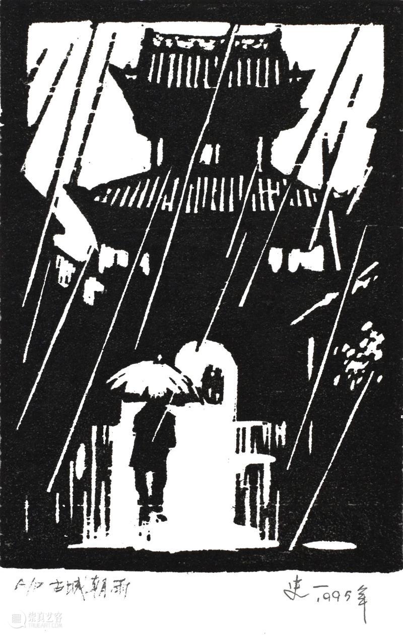 以形式论,一系列有关羌塘的描绘是《雪域之魂》与《雪域之梦》的风格来源。而在技法上诉诸黑白木刻,可能不仅源于其学习的中国美术学院是中国“新兴木刻运动”的重要策源地,也有一份关于传统与时新、外貌和内涵、潮流和自我的思考,更是史一自己所认为的:“黑与白是色彩世界中最神秘、最单纯的美,有永恒的魅力;黑白木刻则具朴实无华,高贵纯洁的艺术品格,所谓不施粉黛,尽得风流,绚烂之极,归于平淡。”[4] 喜欢即兴灵感的史一,从不打草稿,正面下刀,以刀代笔,保留着“刀味”与“木味”。所谓“刀味”就是版面上的刀刻痕迹,“木味”则是“留黑”的手法。[5]这与中国画讲究用笔和“计白当黑”,实有异曲同工之妙。事实上,早于“左翼木刻”十几年的“乐石社”,其作为现代木刻版画的先行者与实践者从开始就自带这样的基因属性。而史一坚持黑白木刻,让我们有机会一窥现代木刻早期的荣光。正如毕克官所言,作为“乐石社”重要成员丰子恺的《立尽梧桐影》,整个画面刻味很浓,梧桐的干有明显的刀刻味;《晚凉》拖鞋、头发、灯泡及“凉”字都能看出刀痕。[6]而史一的《古城朝雨》就是这样尝试的典型代表,大面积“留黑”;城门屋檐的棱角锋利;斜落的雨线刀痕明显。