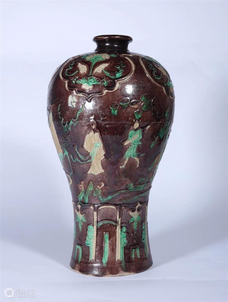 明中期 紫地素三彩高士人物梅瓶