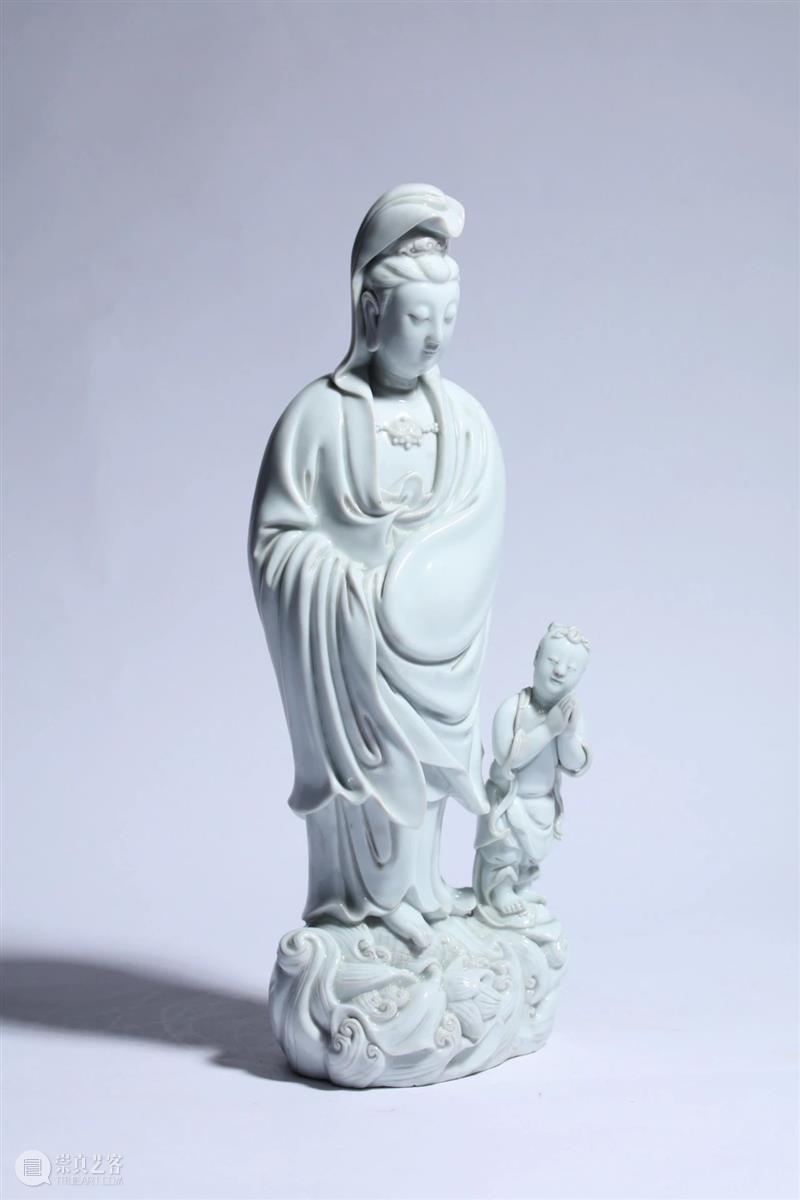 此件渡海观音立像,头发盘髻,戴风帽披肩长巾。面庞丰腴,丹凤眼微垂,颈脖及上胸袒露,胸前横贯一串璎珞珠饰。身着宽袖长衣,双手藏于袖内,圆肩修身,衣纹折迭密集流畅,衣裳下摆翻卷,若迎风飘拂。长裙曳足,赤足踏立波浪之上。旁侧一童子踏云侍立,双手合十更显憨态可掬。此像观音体态娴静秀丽,手足刻画细腻传神,形态逼真,通体施白釉,釉质肥厚,底削釉露胎,胎质坚实细腻,为明代德化立像佳作。