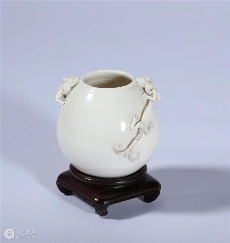 清代瓷器烧造技术成熟,审美风格又崇尚唐宋古意,因此自康熙时期起,对古代名窑的仿烧尤为繁盛。此件仿定窑水盂即为清乾隆时期仿古之作品,鸡心水盂尺寸盈手,作矮唇口,鼓腹圆润,双侧捏塑两只螭龙盘卧,造型纤巧。水盂内外壁满施仿定白釉,釉面匀称光洁,发色纯正,至底削圆整的矮圈足,颇显精巧。此器不仅造型仿古,釉质亦较好地还原了定瓷润白细腻的特征,是一件精巧的仿定瓷作品。