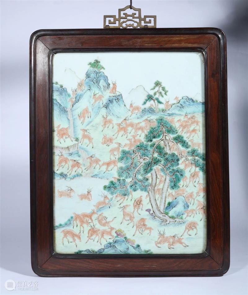 鹿自古即为仙兽,有长寿之吉寓。至清乾隆年间,百鹿图案更是备受皇帝喜爱的一种瓷器纹饰,乾隆帝曾多次下令御窑场烧造百鹿尊、屏等瓷器,《石渠宝笈》中亦有西洋画师描绘的百鹿图,可见百鹿图是颇有清代宫廷气息的瓷器图案。此件瓷板以粉彩绘百鹿图,远山峦迭嶂,苍松古朴有力,群鹿或追逐、或相偎、或憩息、或低鸣姿态各异,整器绘工精细流畅,设彩清丽,充满生机。