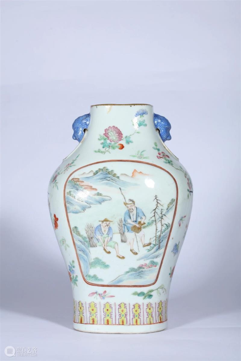 渔樵耕读即渔夫,樵夫,农夫与书生,是清代颇为常见的瓷器装饰题材,通常在文人雅士之间流传,用以表达淡泊田园的文人志趣。此件扁瓶丰肩弧腹,肩上置一对铺首衔环,器壁满绘粉彩花卉,腹中开光并绘渔樵耕读,足部以莲瓣为饰。整器设色清雅,纹饰造型生动。显出清晚期粉彩装饰之特色。