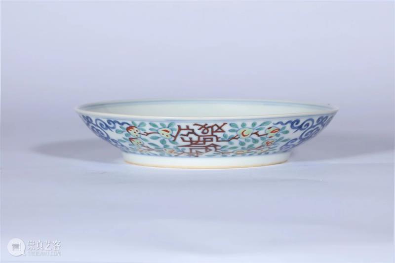 此式灵仙祝寿纹盘之纹饰与器型源于明代官窑,北京故宫博物院所藏一件明嘉靖的五彩“寿”字盘即可称此盘纹饰之粉本(见《故宫博物院藏文物珍品大系---五彩•斗彩》,页19,图18)。至清代官窑时摹此纹饰制瓷,并改为以斗彩装饰。此盘纹饰布局、设色承袭前代清丽淡雅的风格,制胎亦甚规整,显出乾隆时期御窑厂的作器特色。且表面以寿桃及“寿”字为饰,应为当时宫中的贺寿用器,颇为难得。