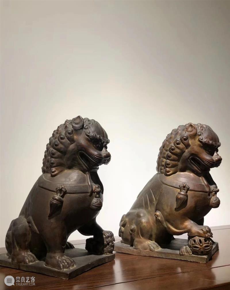 双狮自古即被视为祥瑞之兽,此狮雕塑以陶瓷为胎,狮子呈蹲坐状,嘴露齿,双目圆睁,颈系铃,头背鬃毛卷曲,颇为逼真。狮子蹲坐方座之上,表面漆金,其金层匀称,灿光内敛。瓷座底面亦印塑钱纹,显出精致的作器风格,为少见的官造陶瓷漆金雕塑。