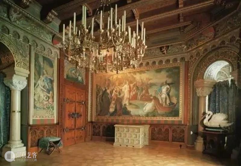 城堡内有大量的天鹅雕塑,还有一幅瓦格纳歌剧中的人物壁画——“天鹅骑士”罗恩·格林。