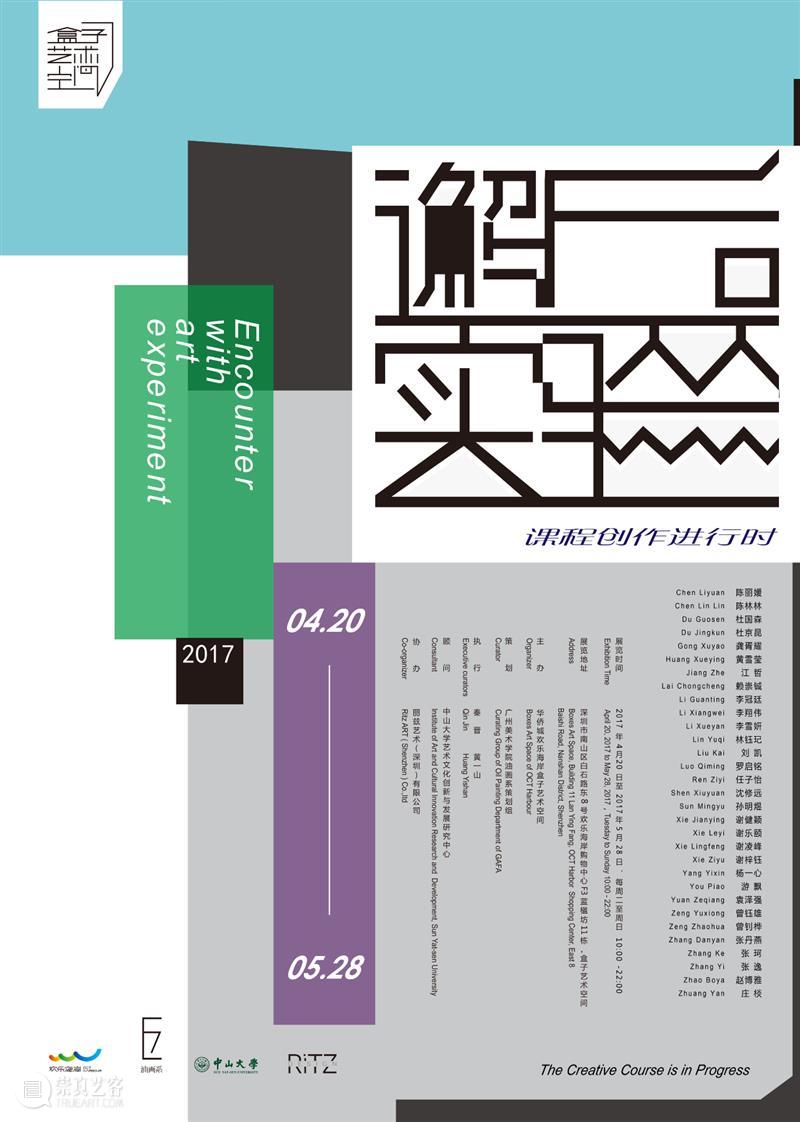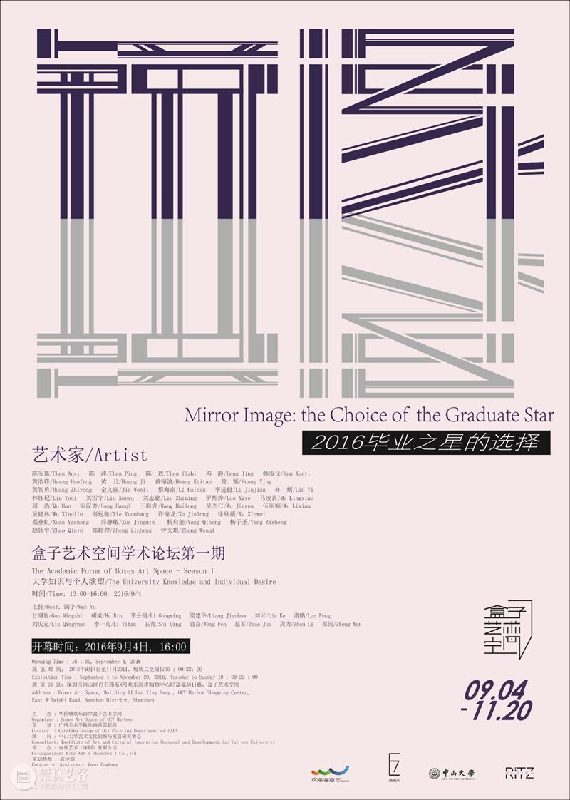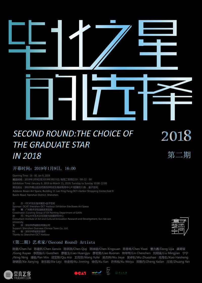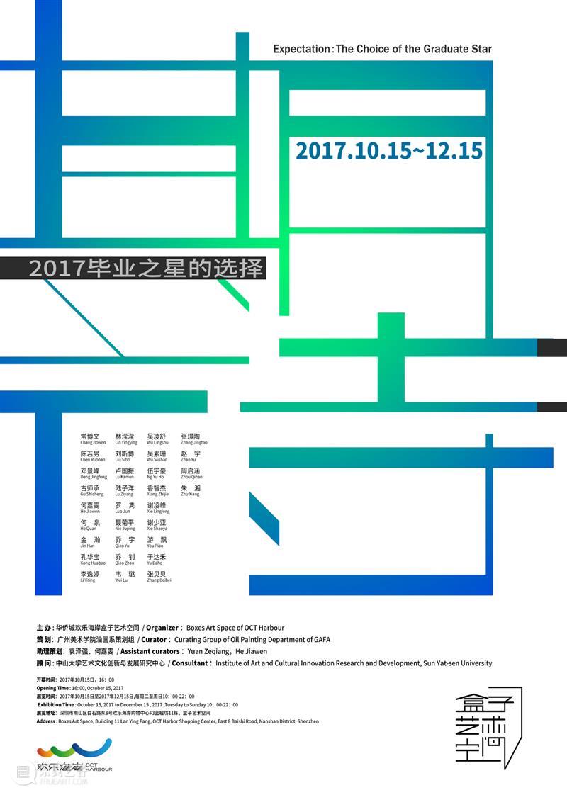 艺术家:常博文,陈若男,邓景峰,古师承,何嘉雯,何泉,金瀚,孔华宝,李逸婷,林滢滢,刘斯博,卢国振,陆子洋,罗隽,聂菊平,乔宇,乔钊,韦璐,吴凌舒,吴素珊,伍宇豪,香智杰,谢凌峰,谢少亚,游飘,于达禾,张贝贝,张璟陶,赵宇,周启涵,朱湘