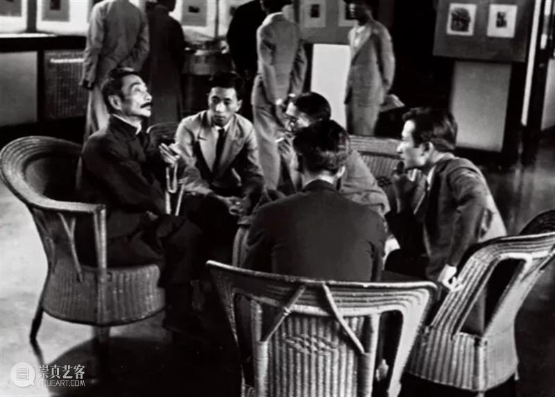1936年10月8日,鲁迅抱病赴上海八仙桥青年会,参观“第二回全国木刻流动展览会”,并与在场的青年版画家促膝座谈,时距逝世仅十ー天。自左至右为:鲁迅、黄新波、林夫、陈烟桥、白危(背影者)。沙飞摄影
