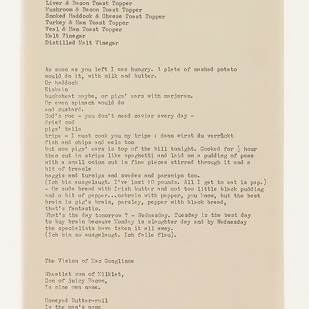 展览作品《精神食粮》的文本涉及营养与思想的相互关系,分为三个部分:一长串市场上在售的英国食品(小牛肉和火腿吐司);用英语、德语摘录的有关食品的电话交谈;以及一首六世纪爱尔兰诗“Mac Conglinne的愿景(The Vision of Mac Conglinne)”,描述了一个由食物组成的世界(“咸牛肉是我的儿子/在大片的脂肪上/大笑”)。