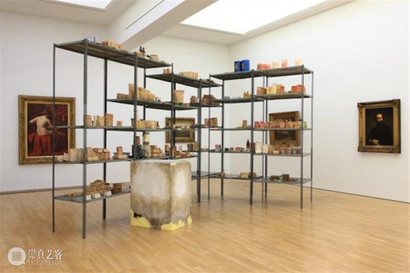 《经济价值》装置中的金属架子上堆满了前东德时期出售的食品和其他生活基本用品。随着时间的流逝,包装磨损了,食物也分解了。墙上挂着泰特美术馆收藏的十九世纪绘画,它们的创作日期大致对应卡尔·马克思的生活时期(1818-1883)。每次展示这个装置时,其中的画作都是不同的,因为它们是从主办博物馆自己的收藏品中挑选的。博伊斯要求以金框形式呈现它们,以表达资产阶级的品味;它们与货架上不起眼的商品形成了刻意挑衅式的对比。
