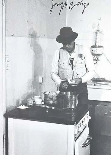 同时,博伊斯也是最早通过电视播出其烹饪过程的艺术家。博伊斯将烹饪视为一种每一个人都能创造的艺术活动。在1979年的一部名为《人人都是艺术家》的记录片中,记录了电视镜头中博伊斯在工作室里准备食物的画面,这些图像无疑成为了“人人都是艺术家”这一宣言本身的宣言。博伊斯提到:“chef一词在德语Küchenchef(厨师)中,指人类头脑的意思。Chef一次就是从‘头’发展而来的。每个人都有自己的头脑,每个人都有可能去判断正在在发生的事情。因此,Küchenchef(厨师)一词也意味着自我判断、自我坚定的合成。这就是chef的意思。”