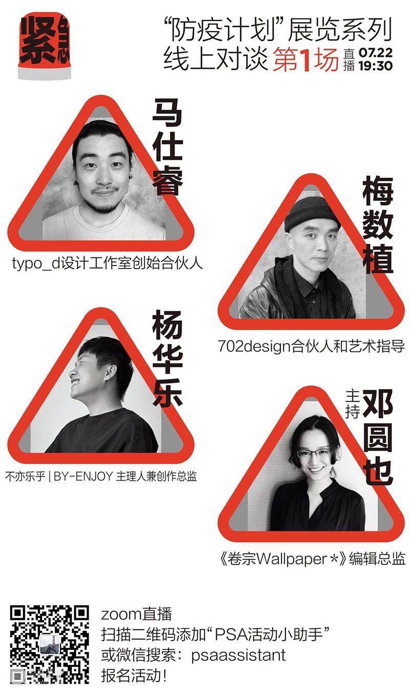 在“psD防疫计划”由线上转为线下进行展示,并以设计之光点亮PSA的同时,两场线上对谈将于7月至8月期间展开。从“设计工作的开展、公共话题表达、平面设计的发展”等角度进行回应——设计师们以何种姿态面对未来可能持续的隔离常态,并在此情境下作出表达。两场对谈将以“紧急时刻下的平面设计”为题,邀请参展的部分平面设计师与公众进行分享和对话。首场线上对谈将在本周三(7月22日)晚间进行。