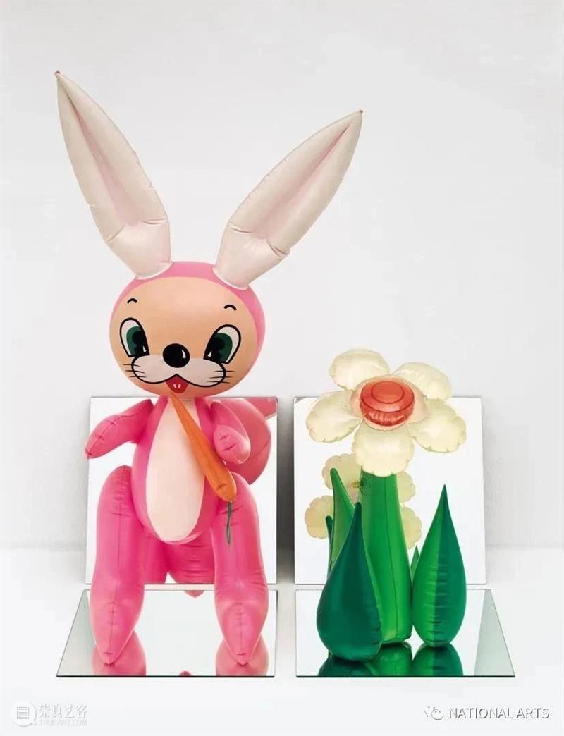 杰夫·昆斯1977年搬至纽约,开始制作能反映城市生活的雕塑作品。他在曼哈顿下城发现了很多日常装饰用的充气玩偶,它们是城市生活的一部分。昆斯开始将它们运用到创作中,将充气的兔子与花朵放置在镜面构成的舞台般的场景中。这让人联想到了达利的超现实主义与杜尚的现成品。
