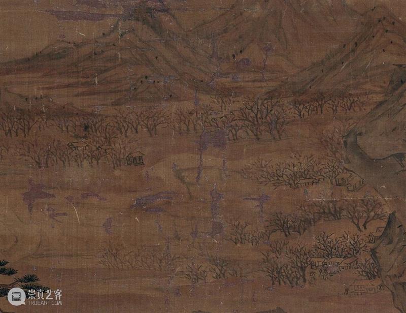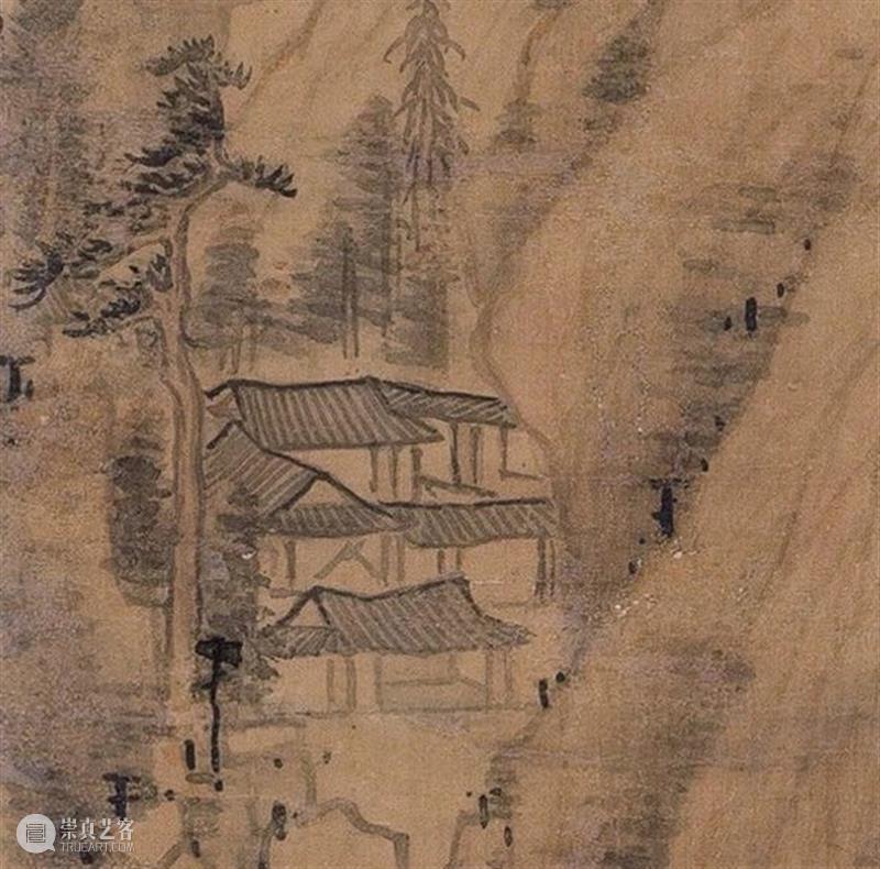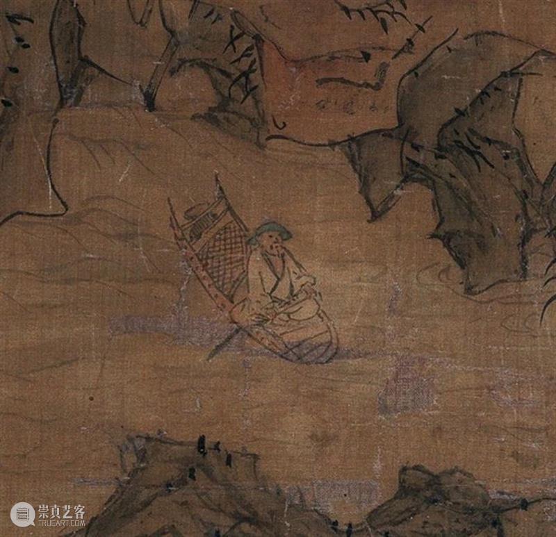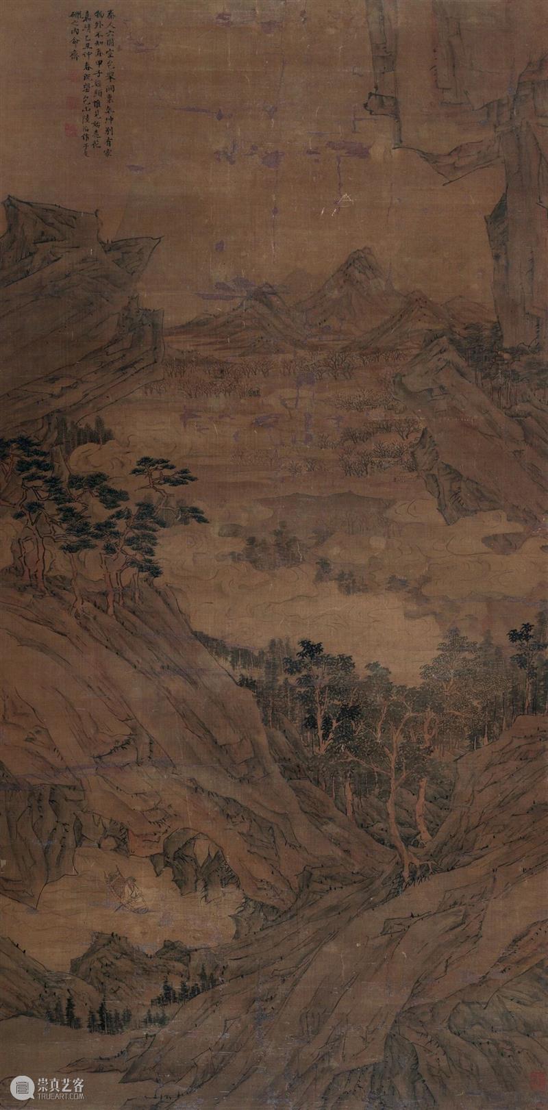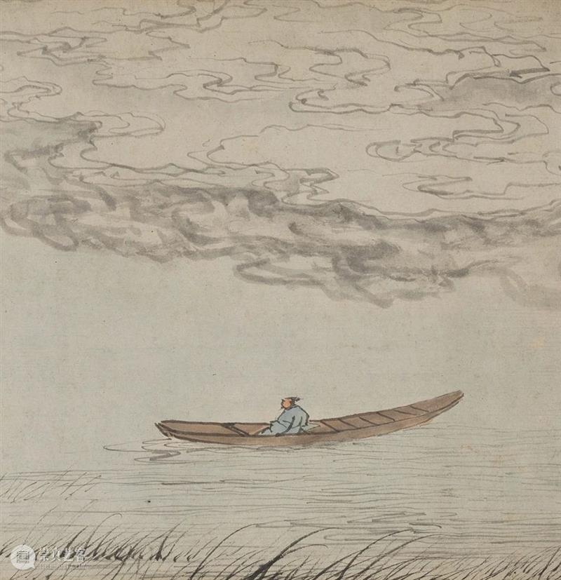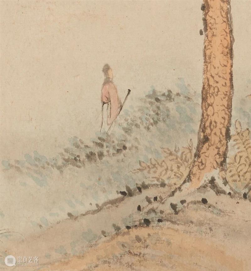 画中描绘了傍晚一红衣隐士自江上行舟而归,船夫撑舟目送,烟雾缭绕之中隐士若隐若现,归隐茅舍的图景,前景一棵挺拔的松树撑起了整个画面,用色极为雅致,松在人前,也寓意着隐士的不屈气节。