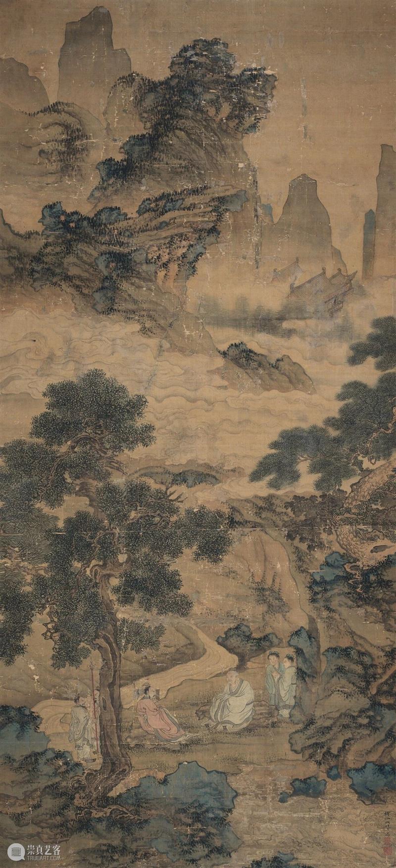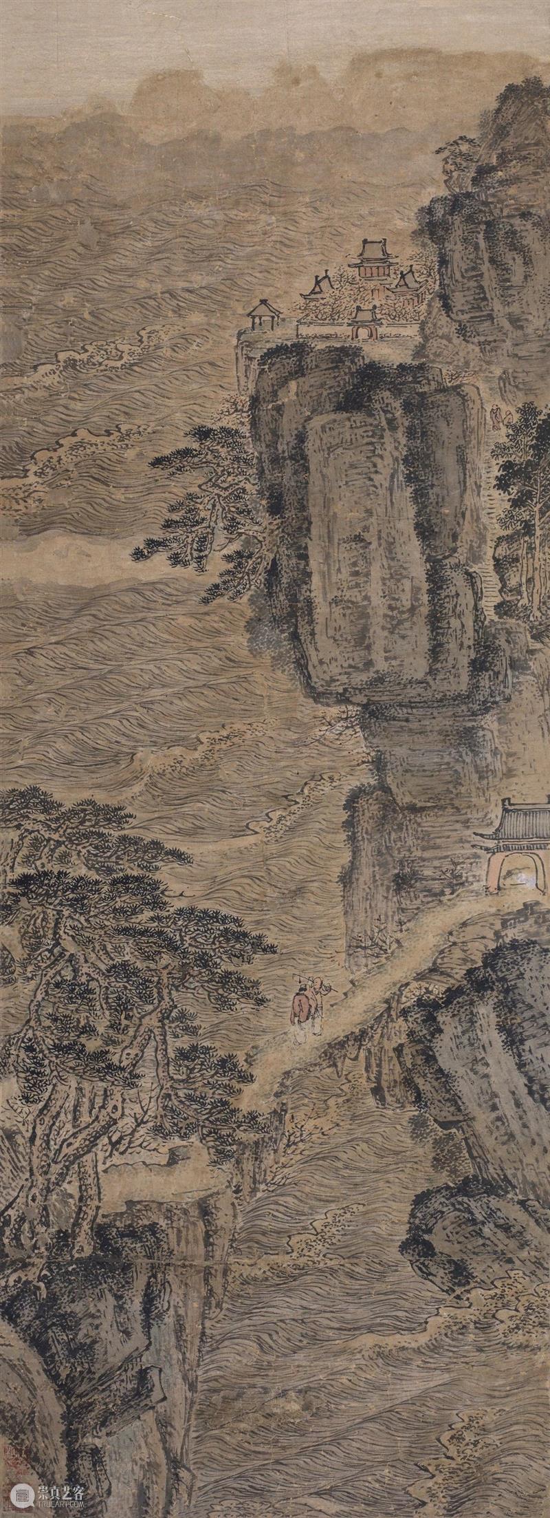 他的《蓬莱访道图》轴(原名《山水》),近两米高,淡设色,近于水墨画,题材为仙山论道,是当时浙派流行题材。