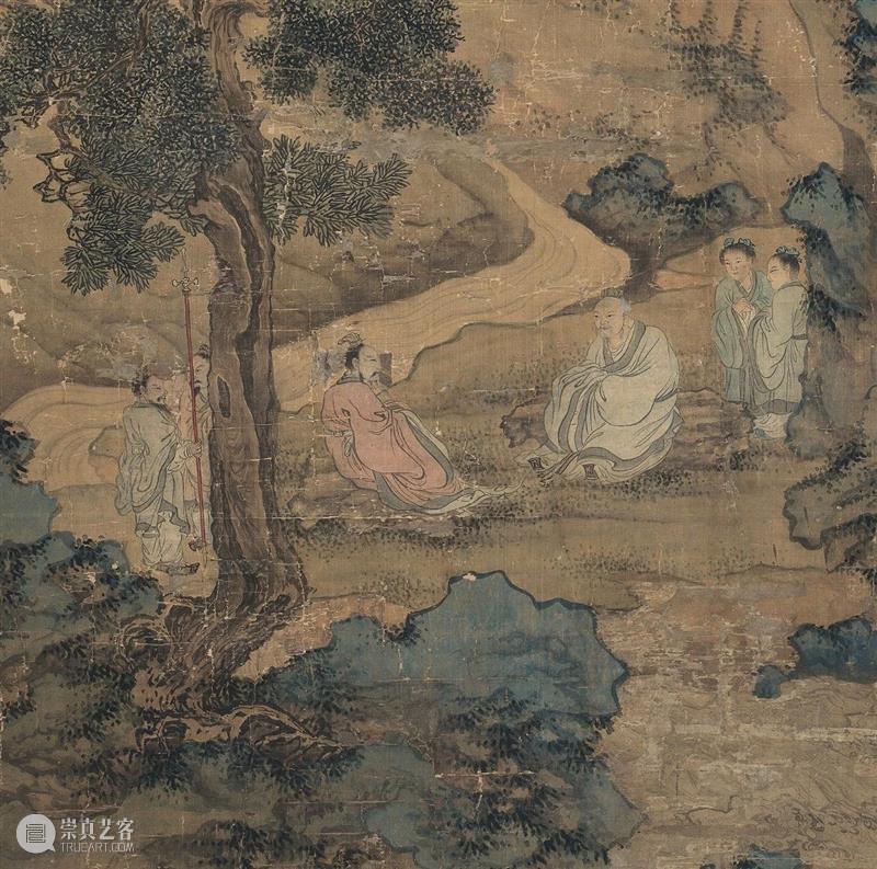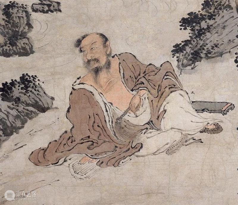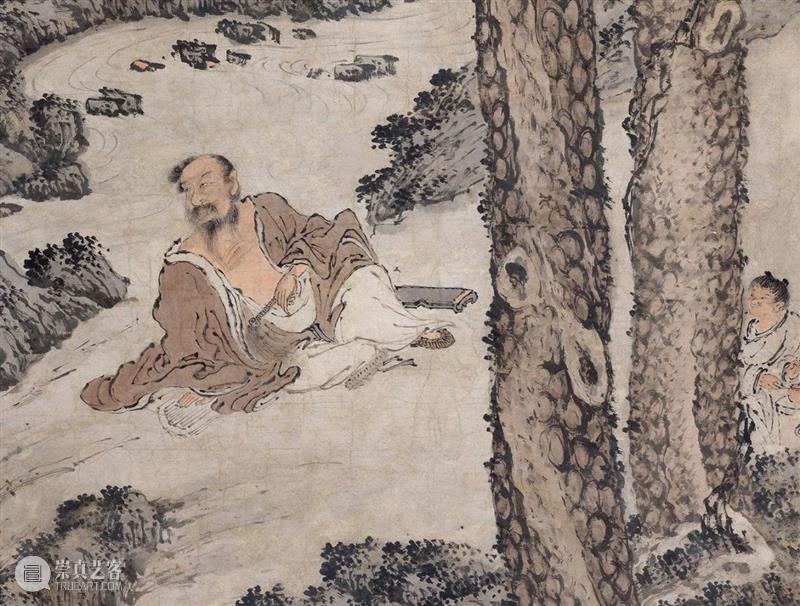 而高居翰讲张宏的山水画是给人一种视觉上的现场感,视幻的错觉。画面中高士席地而坐,手持拂尘,身后放着古琴,侧耳听松声泉韵,怡然自得,侍童隐在树后煮茶侍奉,这是中国古代文人向往的野逸生活的理想境界,是画家表现古人隐逸生活之意的佳作。