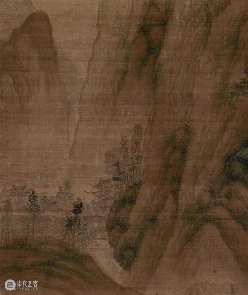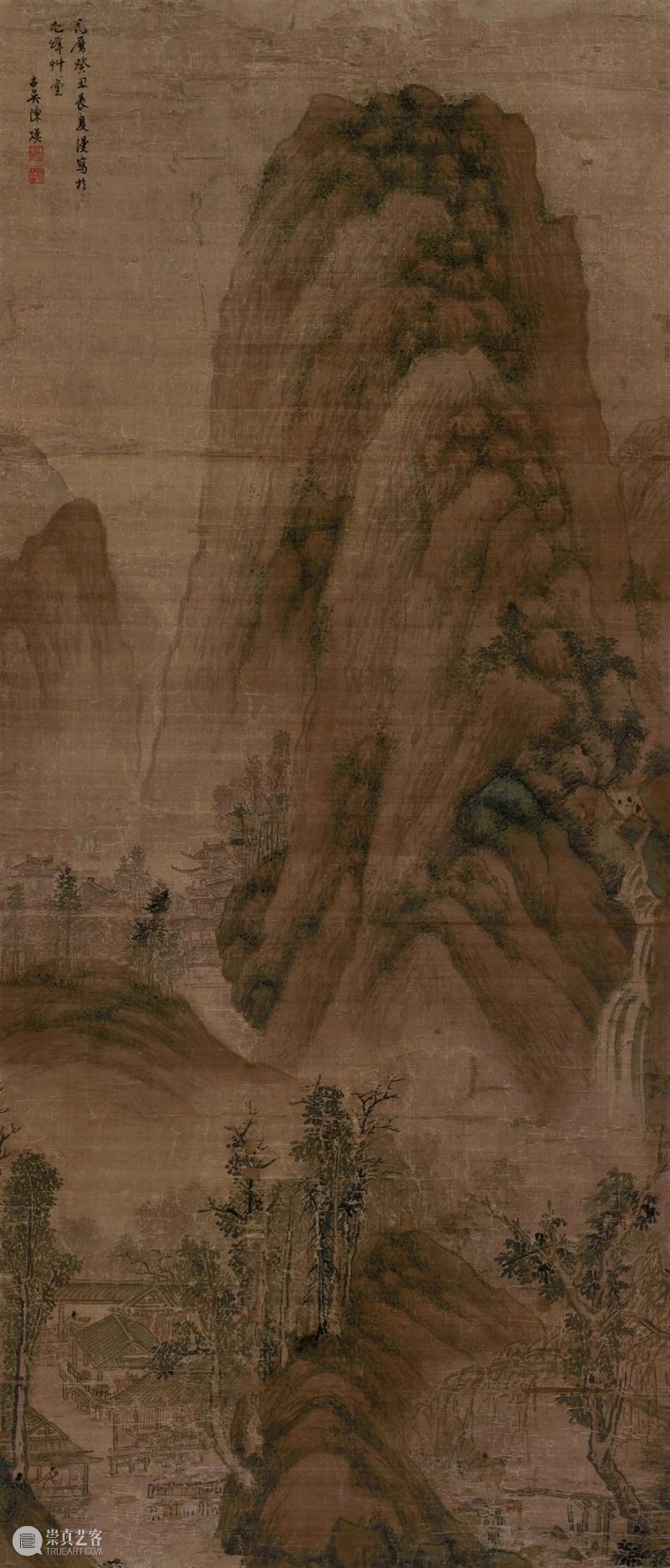 陆治用笔纤细俊秀,用墨不多,笔法风骨峻削,小青緑设色,清润丰厚,是其典型面目。图式趋于几何形体,虽爲小轴,却画出了大的气势。画面虽因绢色发黑,但仍能感觉到画面清新明亮的气质。