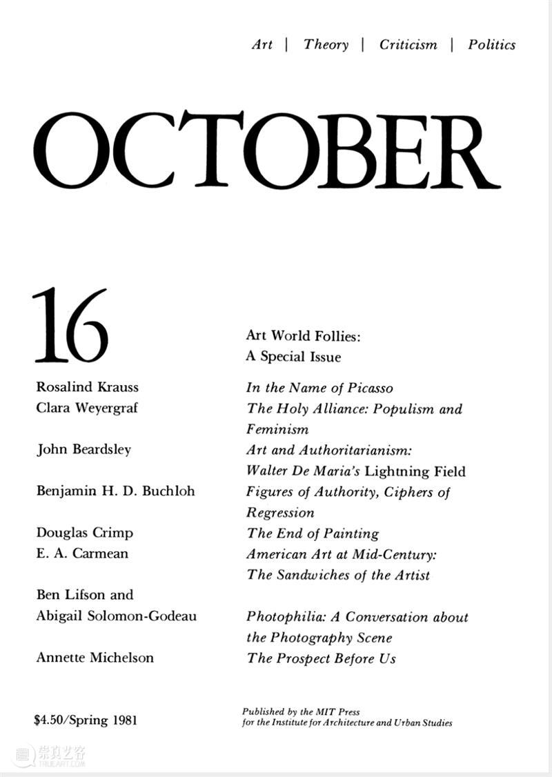 随着展览不断举办,相关的理论回应也开始了,反馈最强烈的莫过于以《十月》杂志为阵地的作者圈子,克林普便是其中的核心成员。1981年《十月》春季刊出版,克林普担任管理编辑,该期主题为“艺术世界的愚蠢之事”,刊登了罗莎琳德·克劳斯的《以毕加索之名》、道格拉斯·克林普的《绘画的终结》以及本雅明·布赫洛的《权威形象,回归的密码》等文章。[x](图3)这期的《十月》显然是论战性质的,编辑们在编者按中坦言:“在过去五年中,《十月》总认为愚蠢已经消失不再。我们的精力主要集中在当代艺术实践、理论和批评中最积极和严肃的方面。但是,在这个五年即将结束时,我们愈加发现,愚蠢并未离去。”[xi]克劳斯以毕加索之名批判了传记式的研究方法;布赫洛则直捣黄龙,批判欧洲新表现主义的保守倾向,认为他们放弃了达达主义的激进传统,“呈现了一个可以被新出现的中上层阶级所接受的前卫观点,它因此成为历史研究、收藏和投机的重点物品”[xii]。比起前两者,克里普的论证策略更显曲折,他引入博物馆体制的批判,通过丹尼尔·布伦的正面例证,再加上摄影的发展,推论出绘画必然终结的观点。