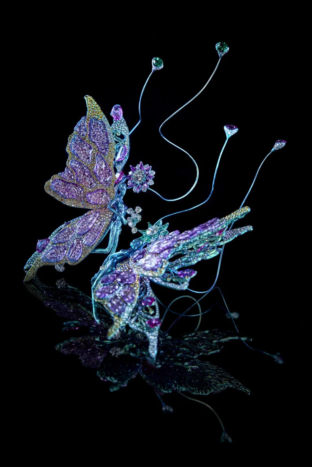 星云蝴蝶的故事令创作者流连星际,想像驰骋,穿梭忘返,于是创造出美妙的蝴蝶星球,让一双蝴蝶星人从此化造人类的美丽联想。它们头上开展心花,手中开出光环,象征升华的智慧、丰盛的生命,以及愉悦的心境。蝴蝶星人的身躯以太空金属──钛金属配合微雕的祥云纹路打造,上面镶以闪鑽彩色光芒,某些部份镶有紫晶浮雕及阴雕,以及各种自由切割的粉红刚玉,以工艺凝住幻彩流光,扭曲视觉,呈现宇宙中无形的声波。它们延伸的触角,除了表达身心平衡之美、表示四周弥漫花的馨香,也代表万物众生之间的共鸣与感通。
