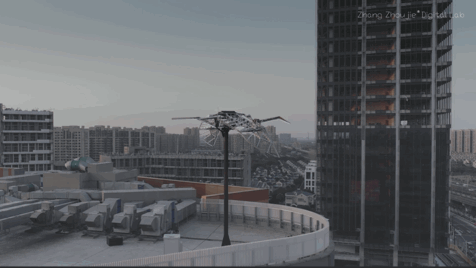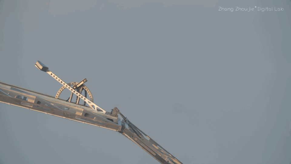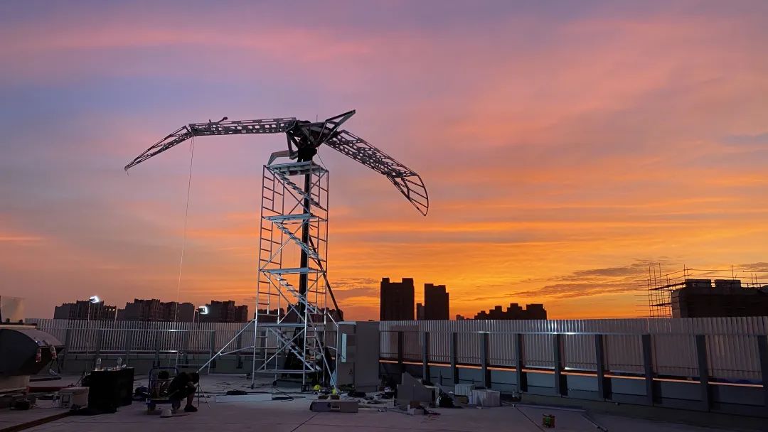 该作品是自张周捷数字实验室成立十周年以来安装难度系数最高的作品,由于需要将如此巨大体量的作品吊装至近四十米的楼顶,且作品自身重达1.5吨,在吊装的过程中有诸多不确定因素,如作品周围环境中的障碍物,不可抗的强风力等。甚至将用于吊装作品的三百吨吊车展开都得花费三个小时。