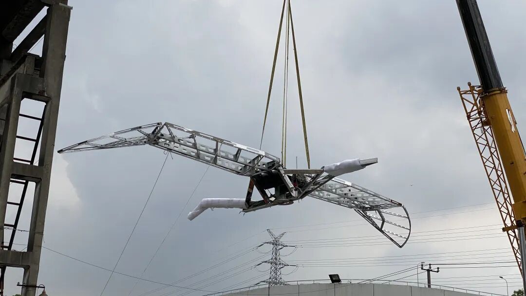 张周捷希望重现飞鹤翱翔于天空的动态自然状态,于是这件翼状机械动态装置作品以前所未有的展翅频幅尺度、电脑控制呼应自然环境变化的动态原理,定格了世界迄今为止规模最大的飞行动态数字装置。其翼展长达13米,因此翼展部分采用了高强度钛合金材料才得以安全保证作品的轻盈性。躯干部分为不锈钢,其高难度的精湛制造技术源于实验室十年来的积累。由于装置作品跃于楼顶,俯瞰整个城市,观者从远处好似能看到一只正在翱翔的鸿鹤。