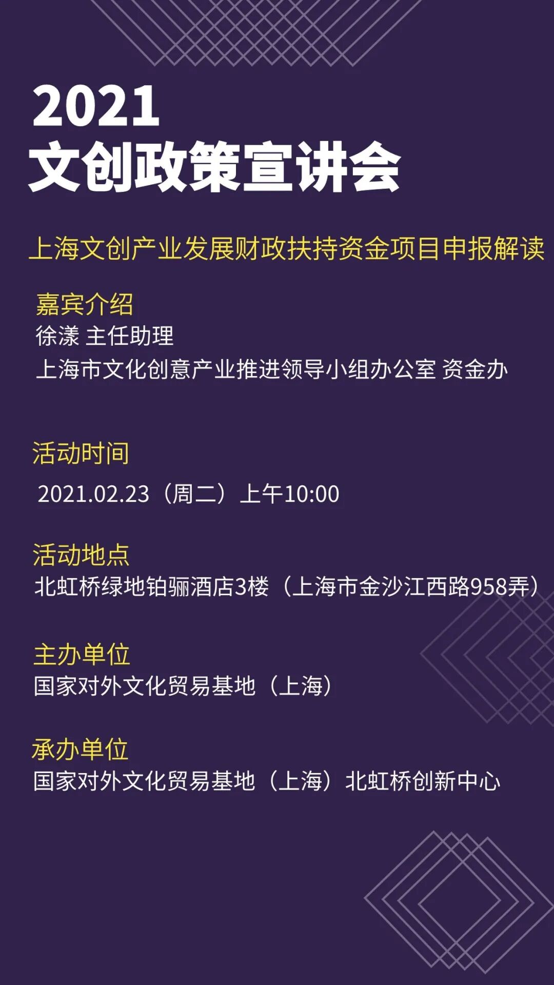 2021年2月23日上午10时,国家对外文化贸易基地(上海)、国家对外文化贸易基地(上海)北虹桥创新中心将于北虹桥绿地铂骊酒店联合举办《2021文创政策宣讲会》,主要围绕上海文创产业发展财政扶持资金相关政策为文化企业做详细解读,腾讯会议线上平台也将同步直播。