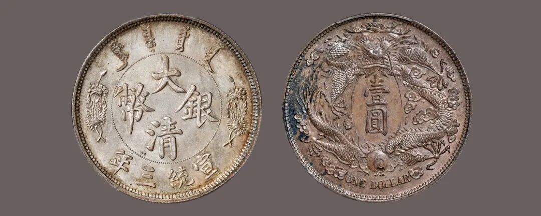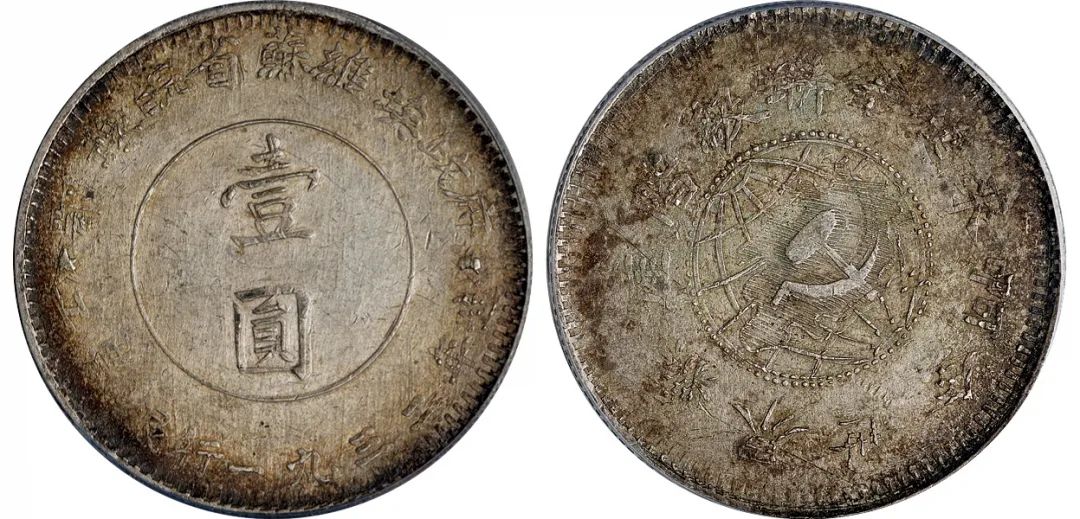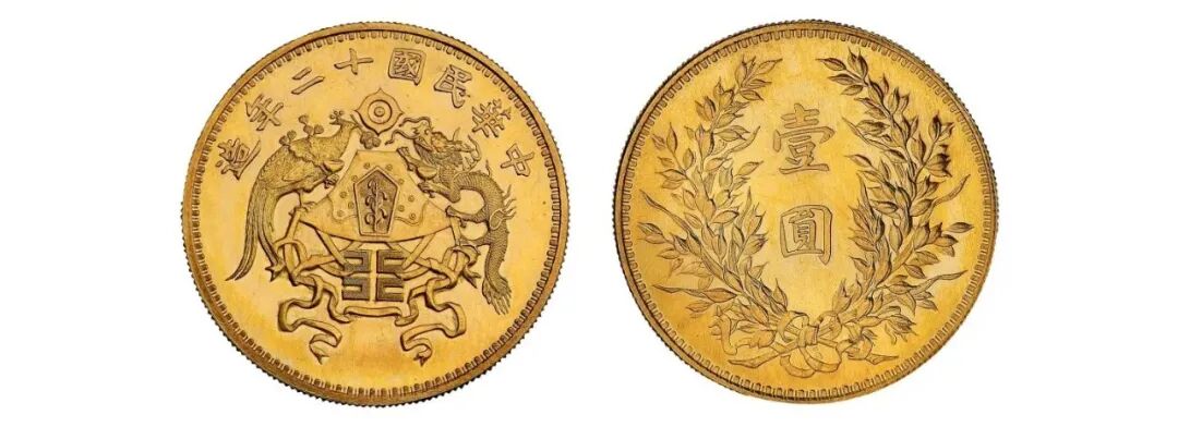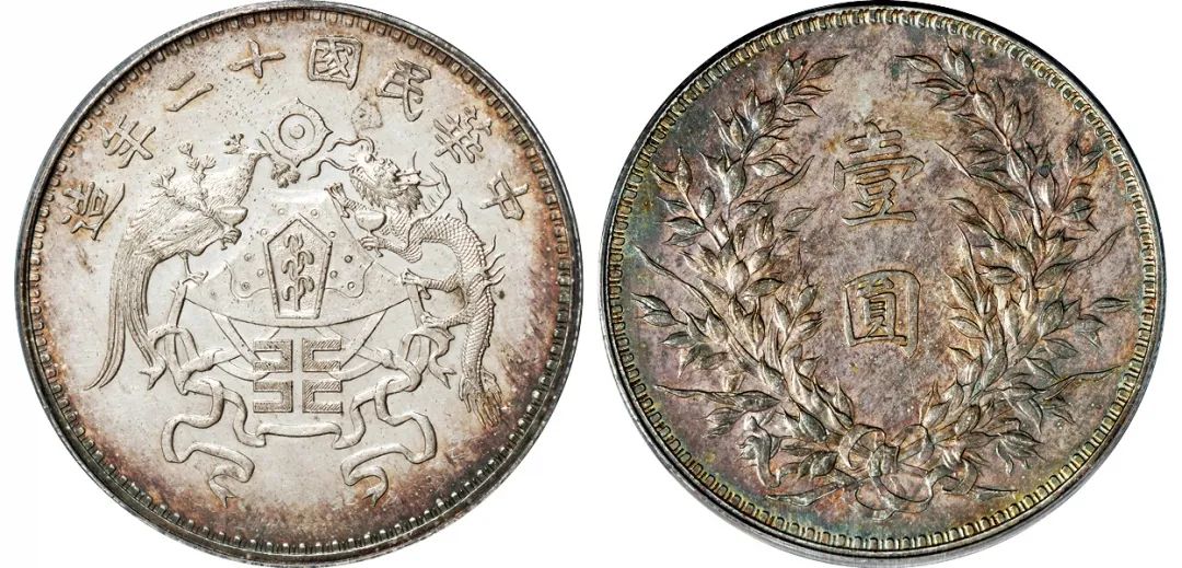 龙凤壹圆银币,实为1923年北洋政府筹划的新国币,因当时上海造币厂尚未开工,由天津造币厂铸造,未正式铸行。背面的“龙凤黼黻图”,原本是北洋政府时期制定的国徽图案,鲁迅1912年任职教育部时,与钱稻孙和许寿裳三人共同拟定。该币图案设计精美,铸额无多,深受藏家喜爱,并根据背面“壹圆”的字体,可分大字版与小字版。此枚为小字版,类镜面深打,细节分明,版底明亮如镜,保存完美如初。