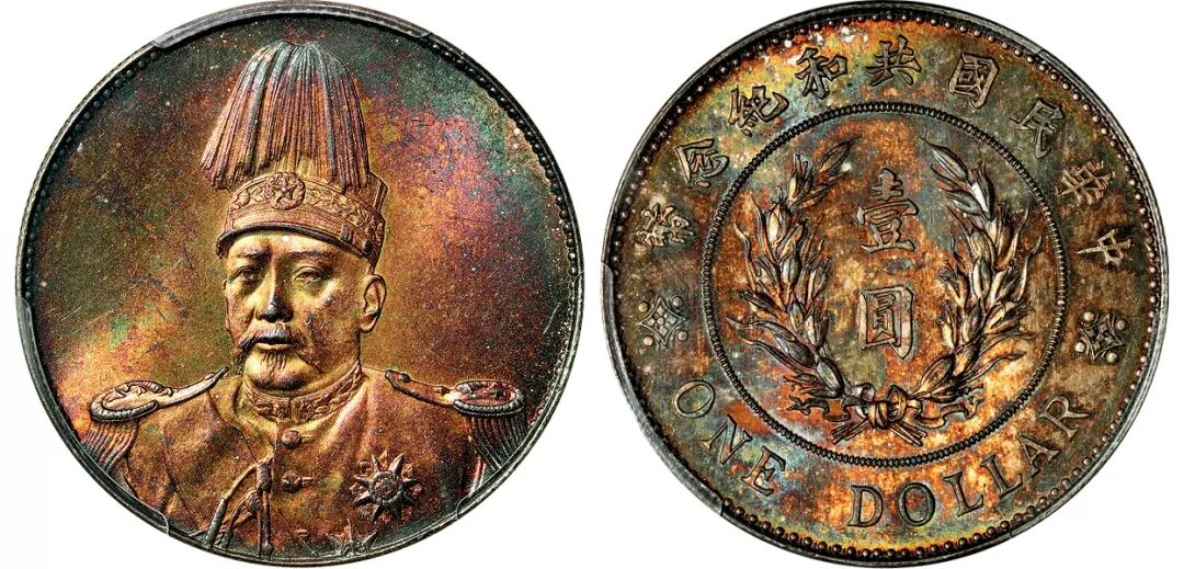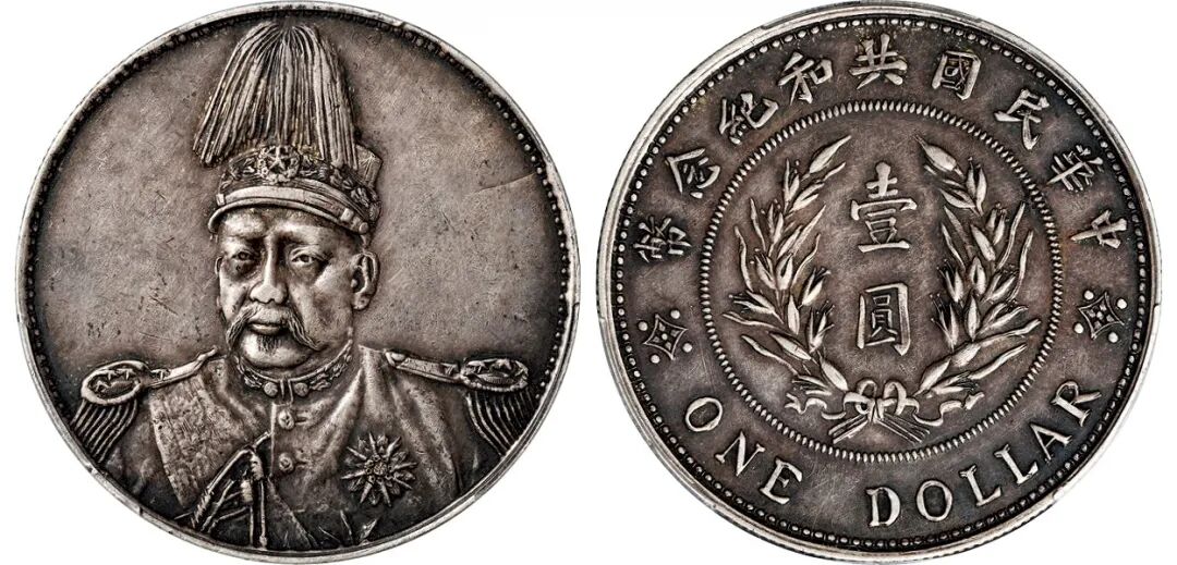 “冲天冠”版银质样币,由天津造币总厂雕模试铸,因袁世凯大元帅服鹭羽冠异常高耸,近乎与币缘相接,大有冲天之势而得名。传为造币总厂学徒摹刻,与正式发行版相比,制作稍欠精美。此币前后共试铸了共和纪念壹圆、中华帝国洪宪纪元二种版别,前者较后者更为稀少,共和纪念“冲天冠”样币目前PCGS公司评级入盒仅二枚。