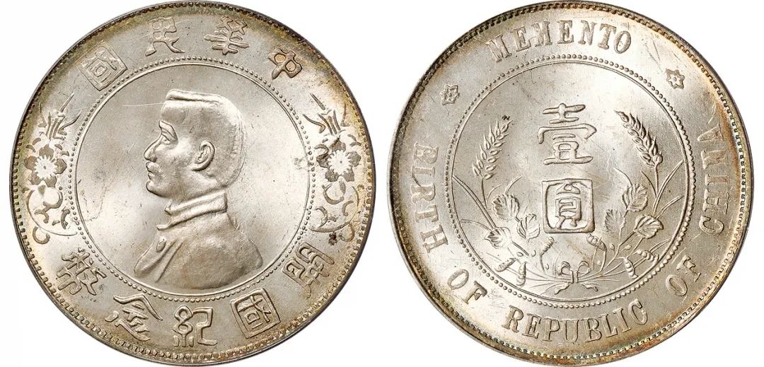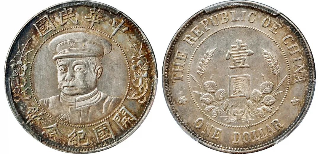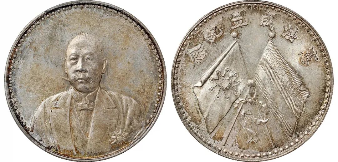 1912年1月,中华民国临时政府在南京成立,黎元洪当选副总统兼领鄂督。当时,武昌造币厂特别铸造了黎元洪像开国纪念银币,钢模由该厂雕刻师朱子芳镂刻,币面主图案为黎元洪半身戎装像,前后有戴军帽、不戴帽二种版式,习称“戴帽黎”“光头黎”,皆产量不多,流通时间短暂。其中,戴帽版之中有背面英文“OF”误作“OE”的英文错版流入市面,但所见不多。此次二款黎元洪像纪念银币,均为品相完美并带有五彩银光的高分佳品,必为藏家所钟爱。