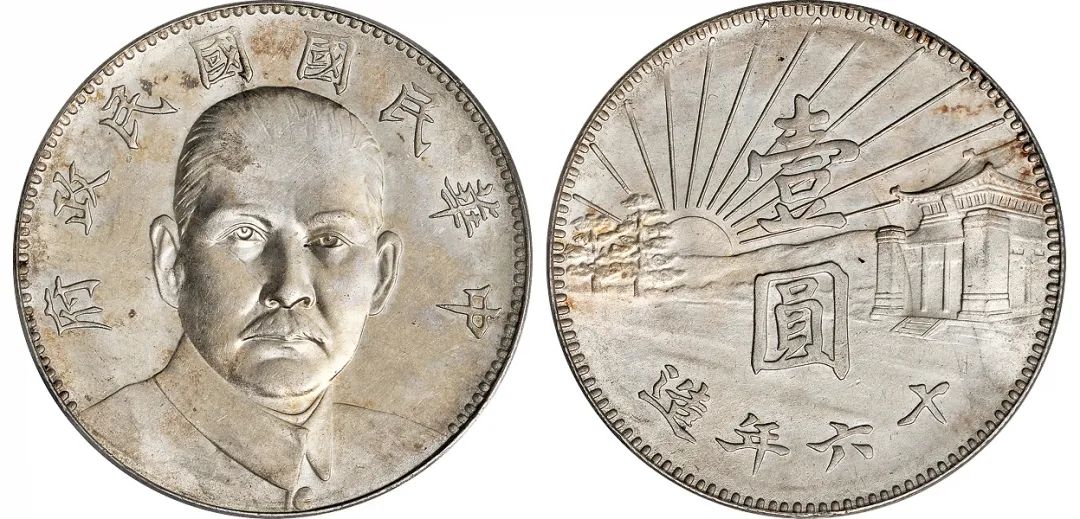 此币系北伐之后国民政府试铸的第一种新国币,模具由奥地利维也纳造币厂总雕刻师理查德·普拉特(Richard Placht)雕刻,南京造币厂试铸,据记载仅制作了480枚。或因外国雕刻师不太熟悉东方人的面容特征,该币呈样后,据说被当局认为“神态面貌更似德国元帅兴登堡而非孙中山先生”,因而未被采纳。此枚铸造精美,币面满溢姣好银光,品相出众。