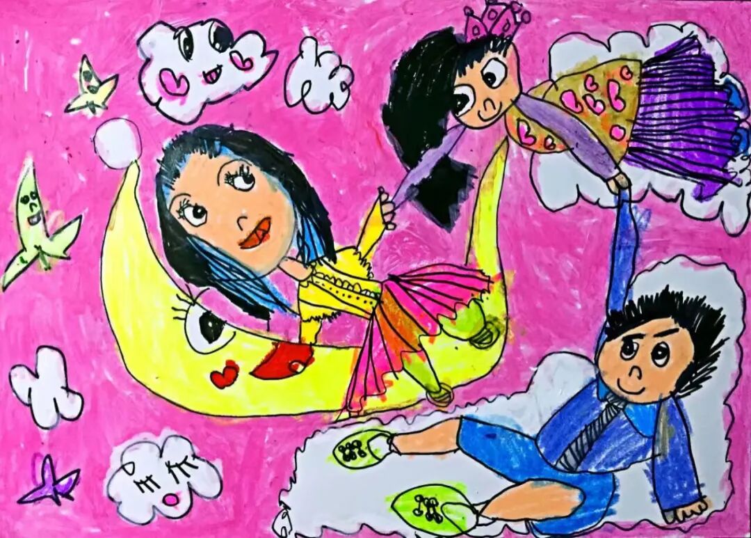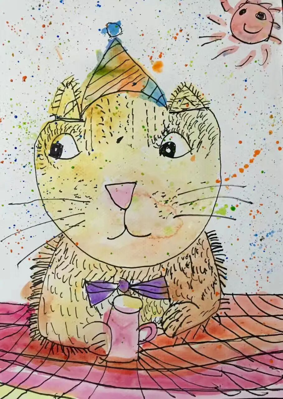 文玥菡小朋友的画面积不大,但她的艺术世界却不小,她在自己描绘的世界里自由自在的来往,无拘无束。从妈妈到爸爸,从狗狗到猫咪,从蜻蜓到蝴蝶,从花朵到花园,无所不画。她把笔下的一切都画成好朋友,让他们始终伴随着自己玩耍、伴随着自己慢慢的长大。说实在的,我都想成为她笔下的人物……