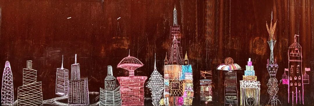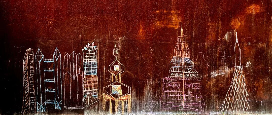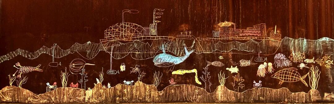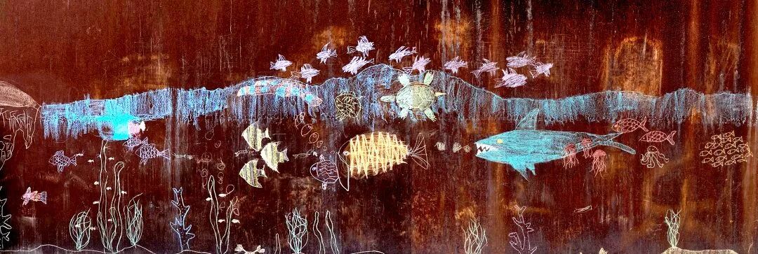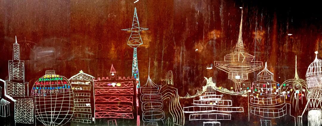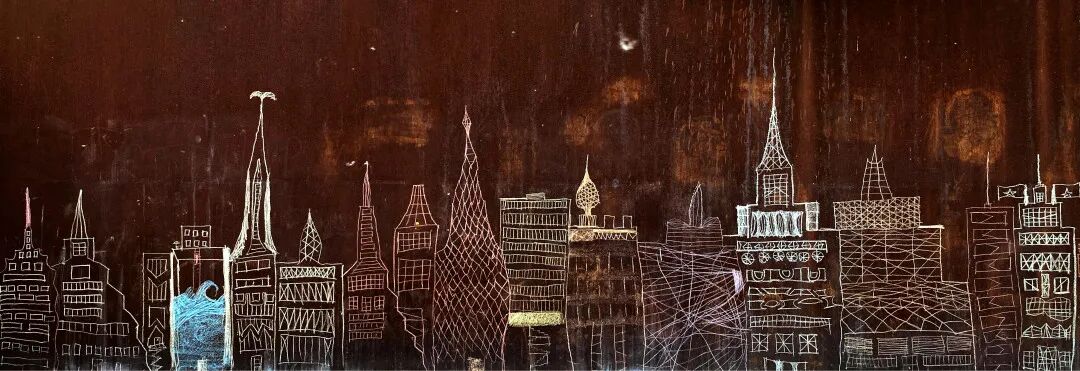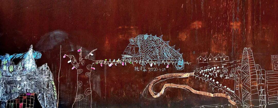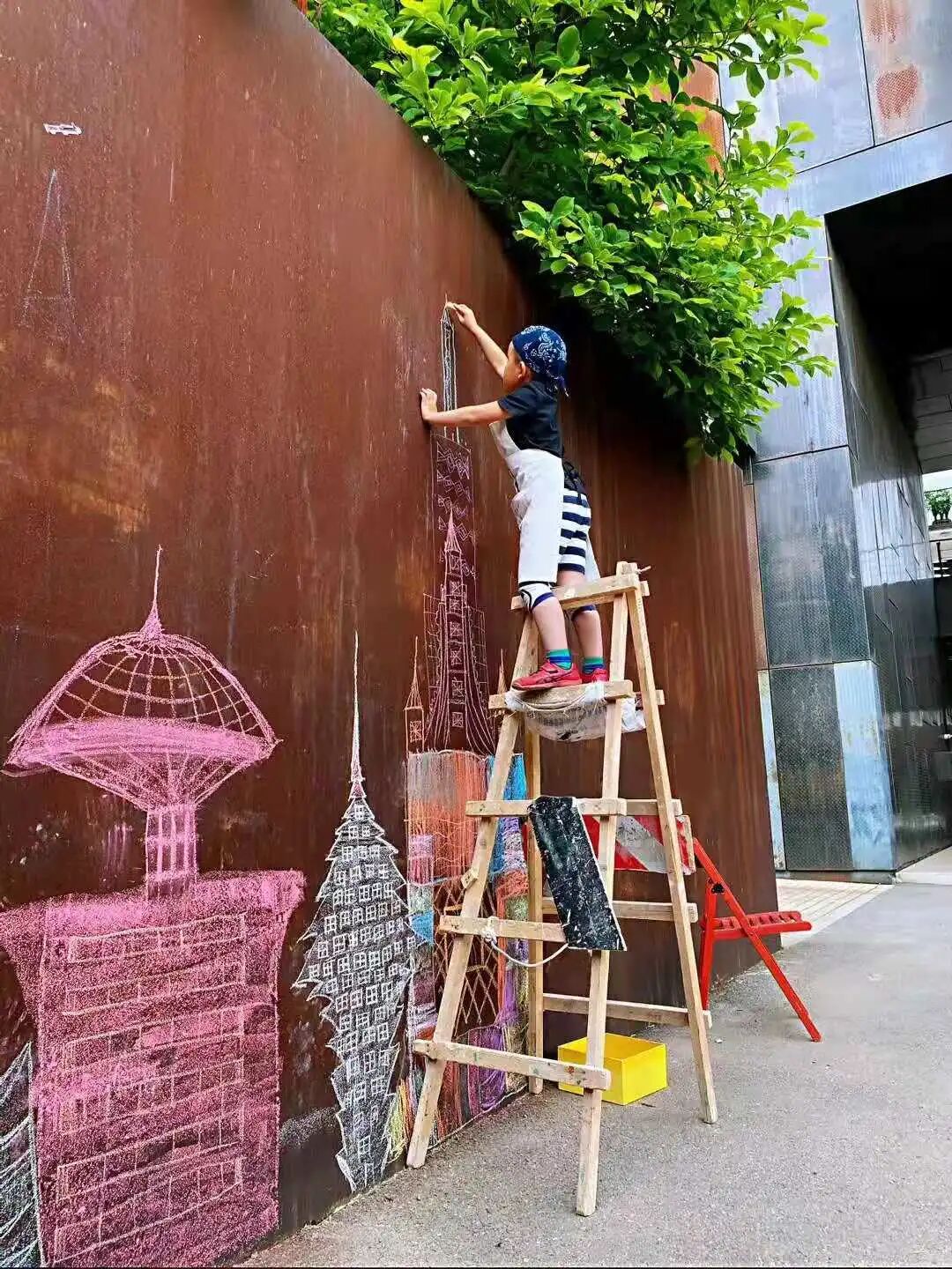 在疫情期间,平时在美术馆、教室、幼儿园里恣意的涂抹几乎成为了遥不可及的事情,而中间艺术工坊家门口前的锈板景观墙在他的眼中变成了天然的画布,手中的彩色粉笔成为了小朋友们对抗单调和乏味生活的武器。时间和空间的限定也使得他有了充分的时间去思考想要说的话和想要画的画。各种城市、建筑、海洋形态以极快的速度得以在巨大的锈板上呈现,当然这种速度也是迫于对天气变换的无奈应对,因为一场春雨过后,墙面被雨水冲刷的一切归零,创作又需重新开始。