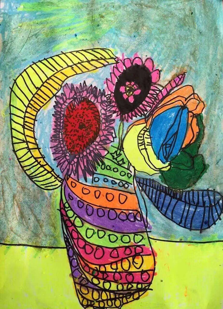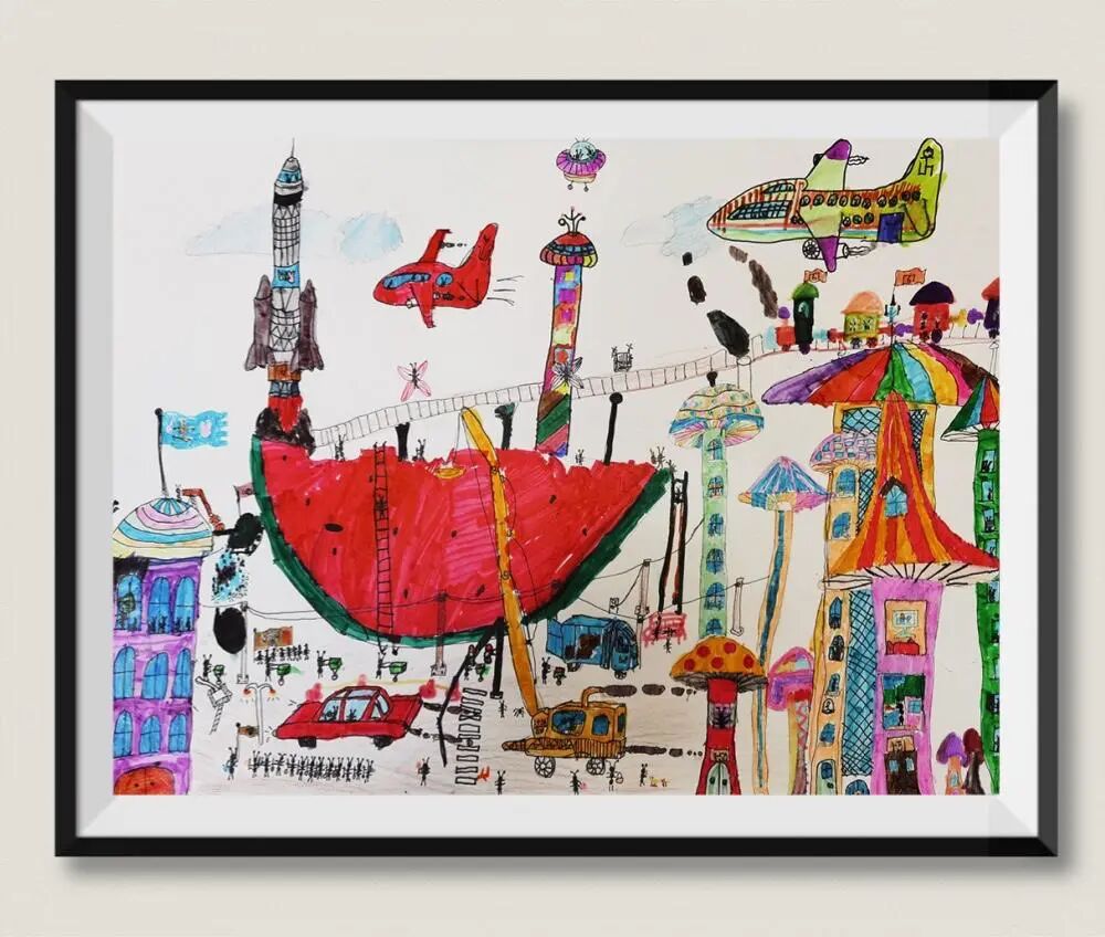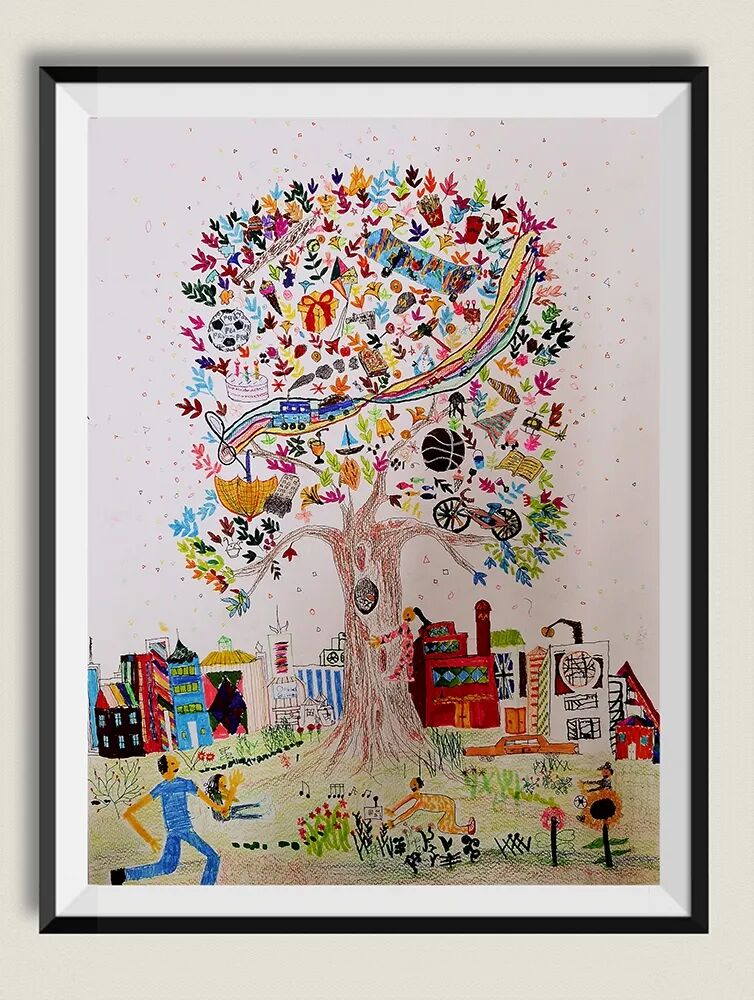 由于没有任何的束缚,小朋友的想象力和丰富性完全通过自己的视觉图示语言来表现,每幅作品的表情都是全新的,正如在《城市》这幅作品中,每个建筑都是他自己内心朴素、简单、奇妙的构思,建筑师可能看到了西尔斯大厦,东京天空之树、新宿蚕蛹大厦、瓦西里教堂,人民广场飞碟楼等,而在他的眼中画的却是玉米楼、酒瓶子楼、国旗楼、蛋糕楼、圣诞树楼、国旗楼、雨伞楼、冰激凌塔和国王的城堡等。