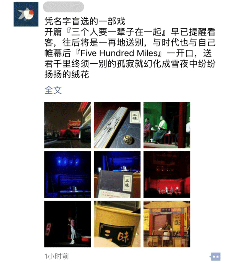 今晚应羊朵召唤,在鼓楼西剧场看《三昧》,是近期看到的最被打动的一部戏!这些年代我都经历过,感动!