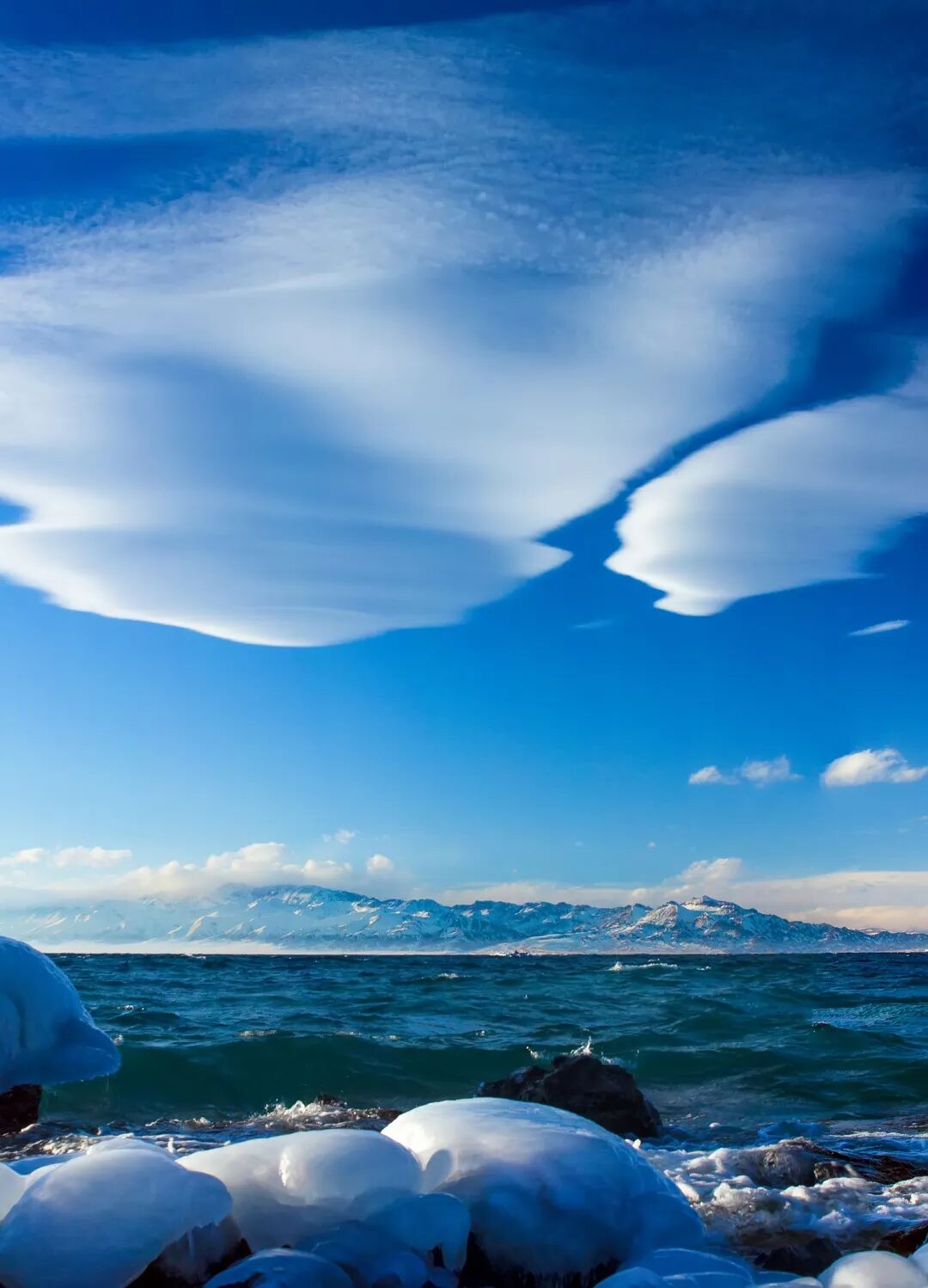 蓝色的湖水和白色的冰块,才有了赛里木湖冰推期独有的景观。