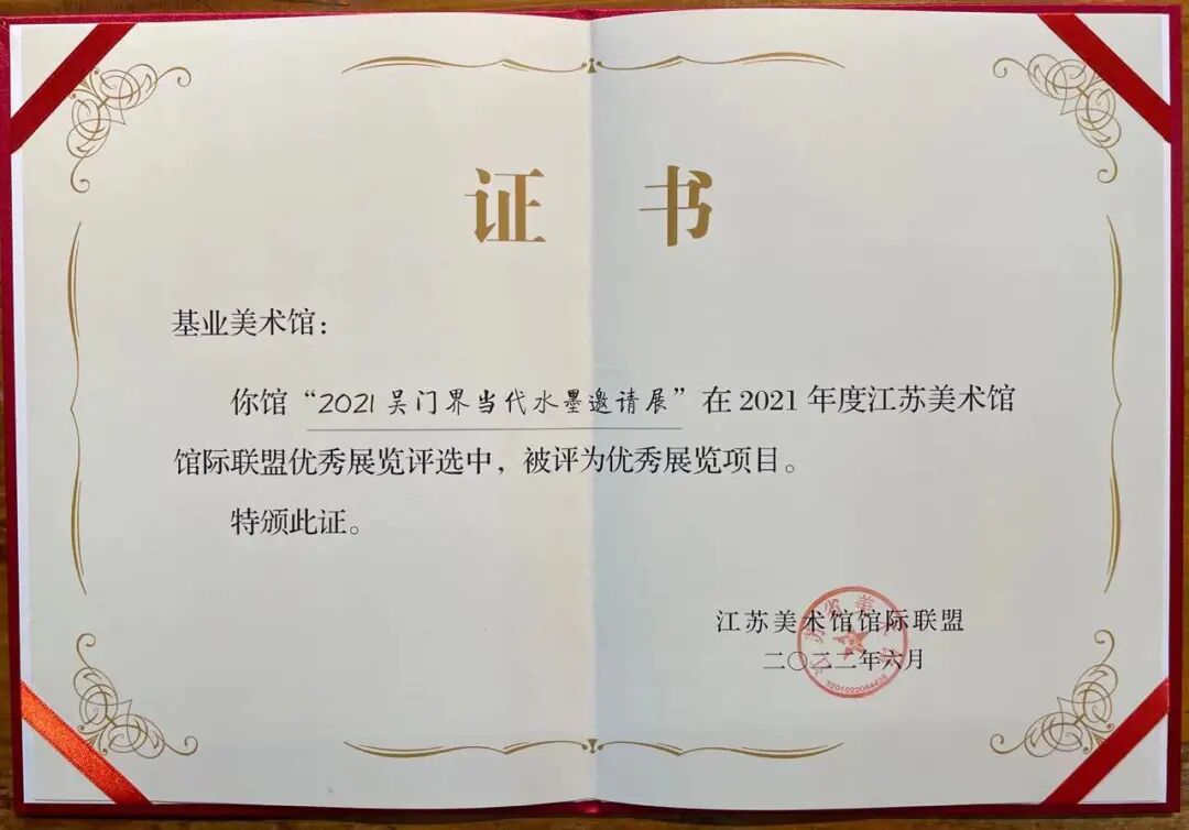 苏州基业艺术馆2021年11月13日举办的“吴门界”当代水墨邀请展在众多展览评选中脱颖而出,获得了“江苏美术馆馆际联盟优秀展览项目”的称号!