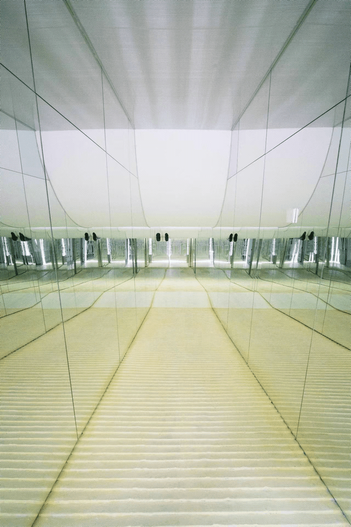 在第一期的Critique room艺术现场中,艺术家娄能斌与策展人姚斯青合作,带来为画廊的镜面长廊空间而创作的声音装置《宛在水中央》。作品的名称源于《诗经·蒹葭》中的名句,“所谓伊人,在水一方。溯洄从之,道阻且长。溯游从之,宛在水中央。”