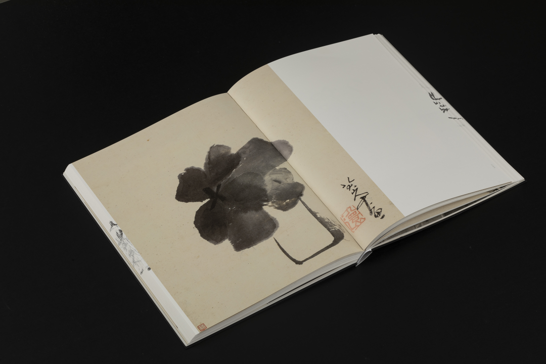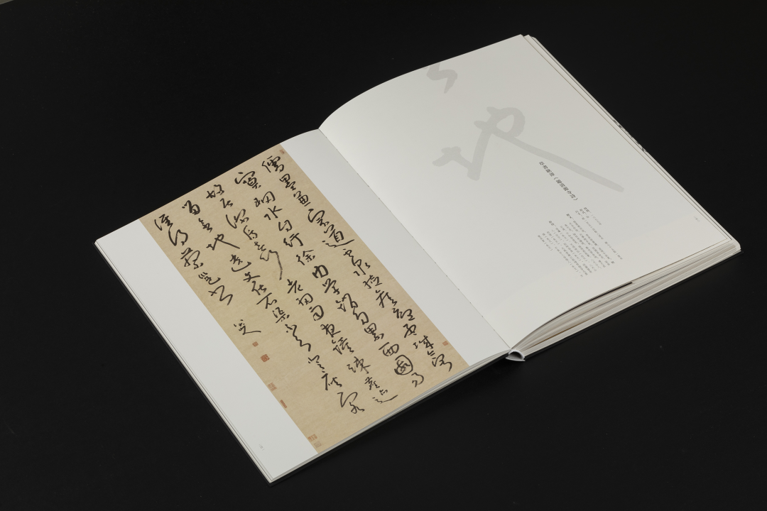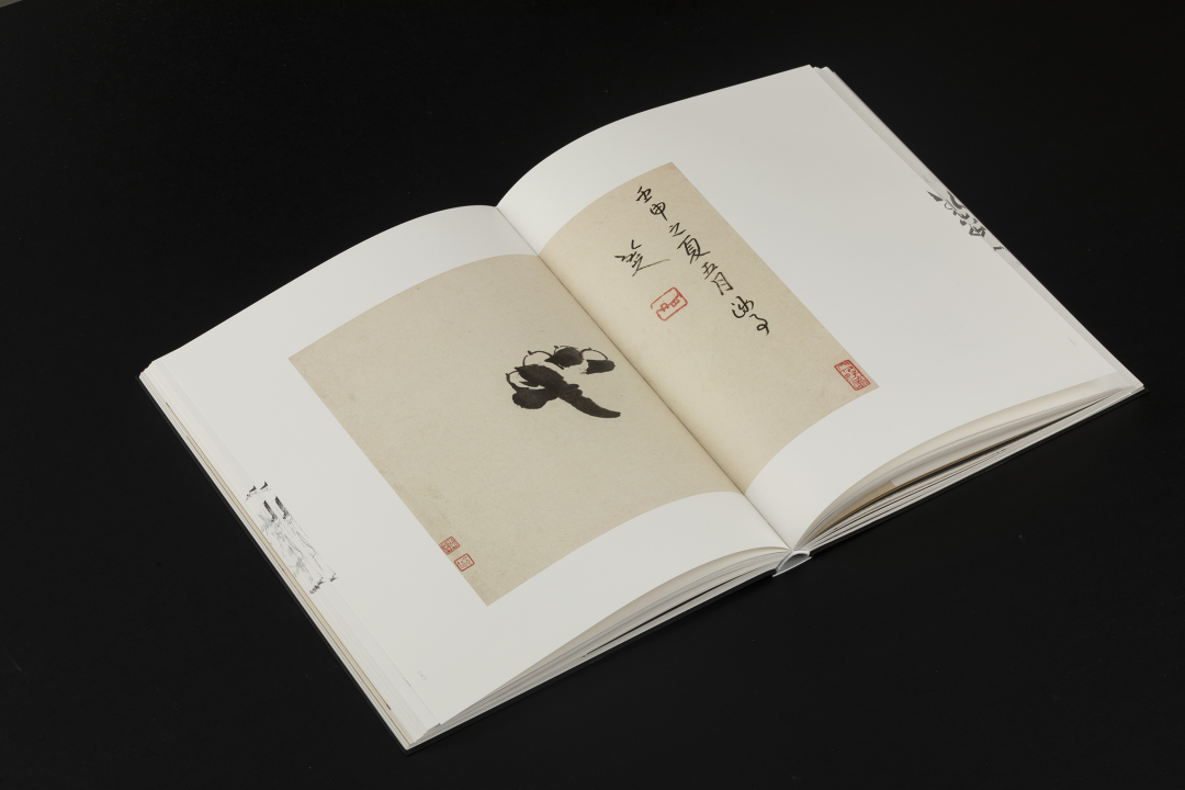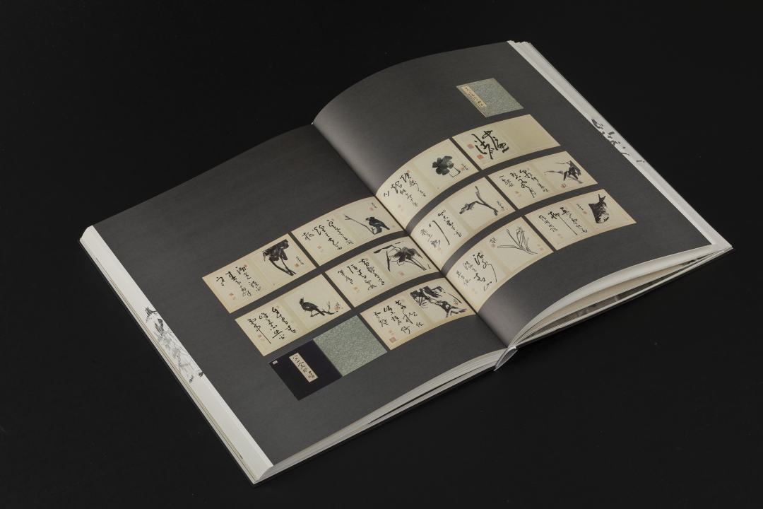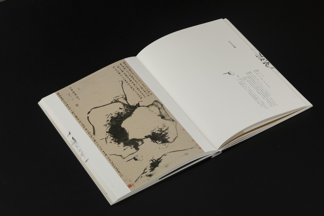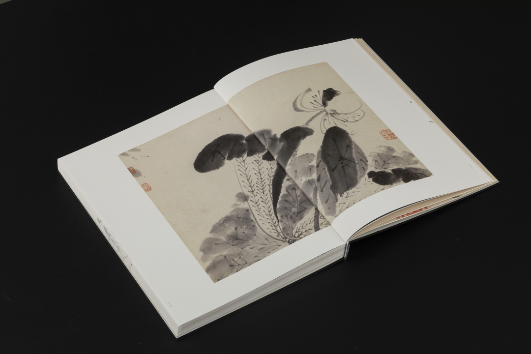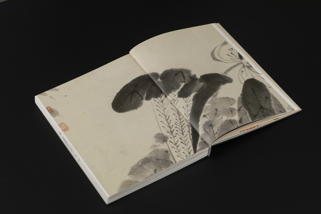 本书的设计初衷是给读者耳目一新但不脱离八大的美学感受。可摊平的法式软精装既有画册的视觉愉悦,又有拿握翻阅的舒适感;跨页、拉页、折页,原大、放大都尽情展示八大艺术高峰的精彩时刻。书口,这里我们做了一个有“心意”的设计:顺翻是八大的画像,逆翻是八大的签名。比如《(传)宋拓怀素草书〈圣母帖〉并八大山人行楷书释文题跋》。它是一个长卷,在设计上做了四开拉页的呈现。再如《兴福寺半截碑》,装帧上做了一个原大的设计。希望能让读者朋友能够更加真实的感受到作品的气息。这一手《兴福寺半截碑》在装订的时候要手工锁线。因为原大尺寸是小于书籍尺寸的,在纸张克数选择、页数装订、与书籍整体厚度考量上都花了很多的精力。终于较好还原作品的原貌。经过多种材质的打样,总共有两个版本,精装本与特装本。八大山人笔下的荷花清朗萧逸,极能彰显其艺术特色,故而在精装本设计中,特选取荷枝作为封面元素来开启八大山人的艺术世界。法式软精装带来良好的阅读体验,而对传统中式书装中的签条予以加宽,以及使用传统中式典雅配色,则在增强设计动感的同时,强调了中式书装的美学理念。