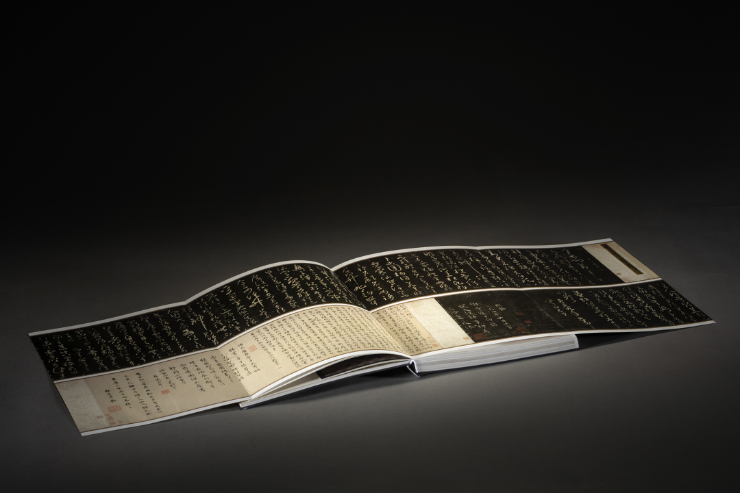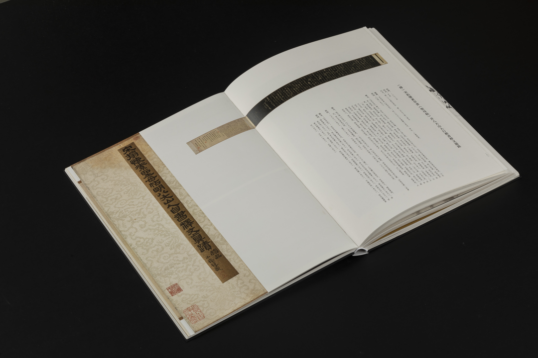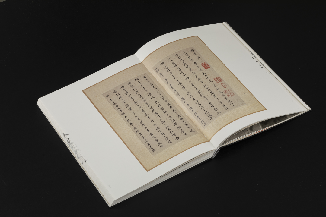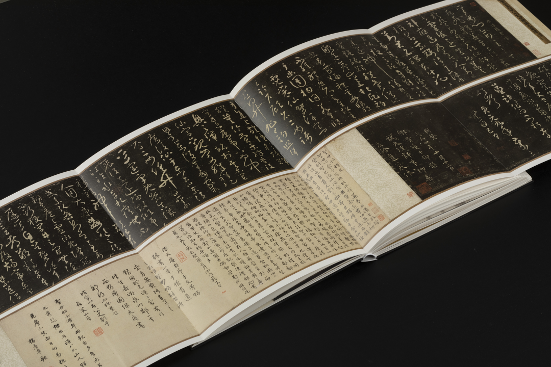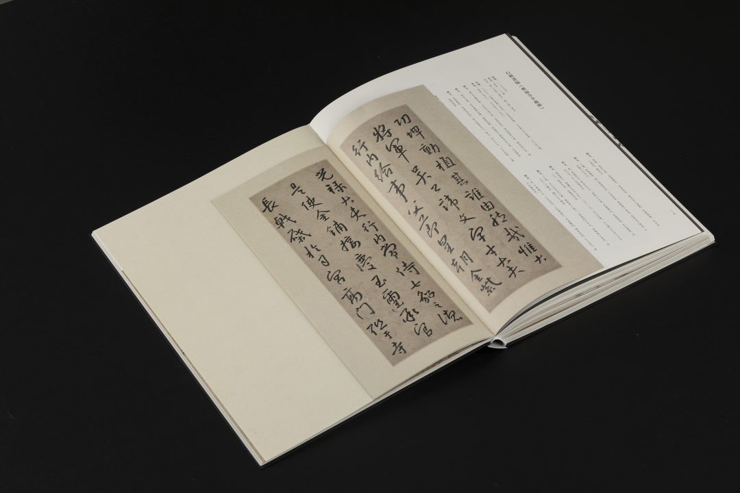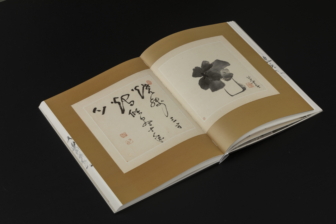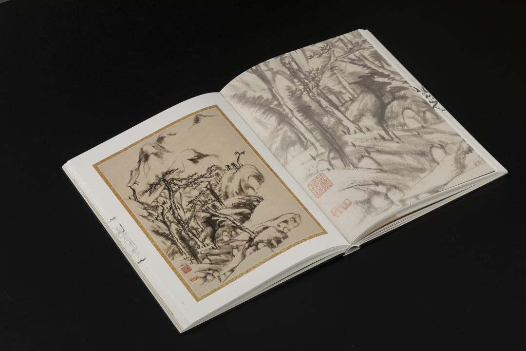 本书的设计初衷是给读者耳目一新但不脱离八大的美学感受。可摊平的法式软精装既有画册的视觉愉悦,又有拿握翻阅的舒适感;跨页、拉页、折页,原大、放大都尽情展示八大艺术高峰的精彩时刻。书口,这里我们做了一个有“心意”的设计:顺翻是八大的画像,逆翻是八大的签名。比如《(传)宋拓怀素草书〈圣母帖〉并八大山人行楷书释文题跋》。它是一个长卷,在设计上做了四开拉页的呈现。再如《兴福寺半截碑》,装帧上做了一个原大的设计。希望能让读者朋友能够更加真实的感受到作品的气息。这一手《兴福寺半截碑》在装订的时候要手工锁线。因为原大尺寸是小于书籍尺寸的,在纸张克数选择、页数装订、与书籍整体厚度考量上都花了很多的精力。终于较好还原作品的原貌。经过多种材质的打样,总共有两个版本,精装本与特装本。八大山人笔下的荷花清朗萧逸,极能彰显其艺术特色,故而在精装本设计中,特选取荷枝作为封面元素来开启八大山人的艺术世界。法式软精装带来良好的阅读体验,而对传统中式书装中的签条予以加宽,以及使用传统中式典雅配色,则在增强设计动感的同时,强调了中式书装的美学理念。