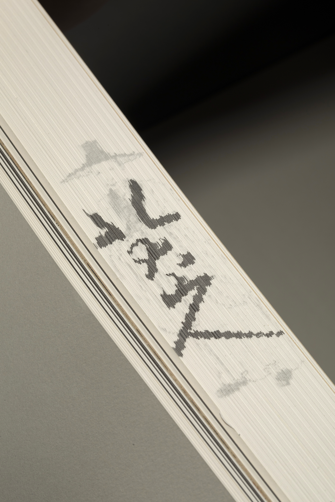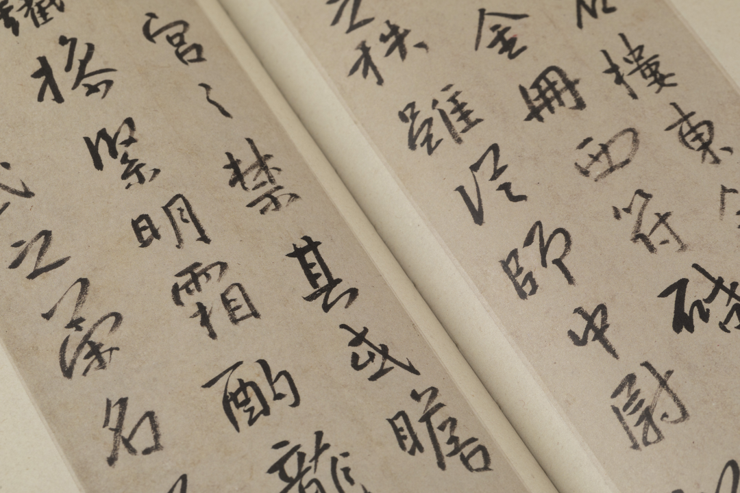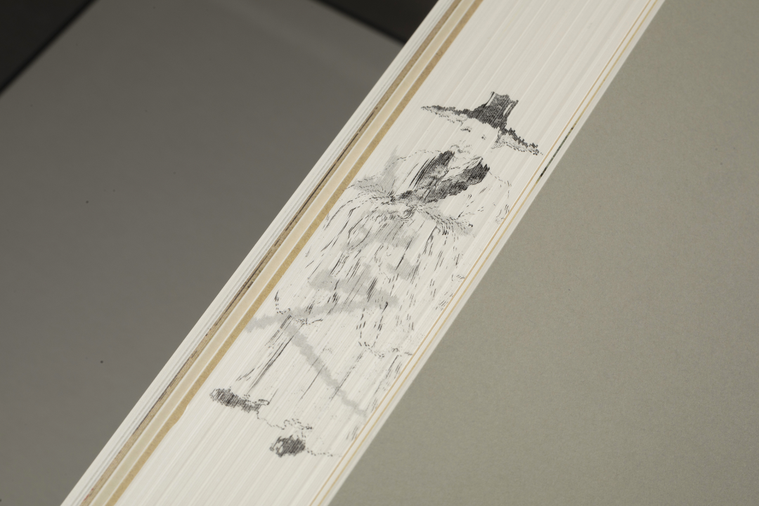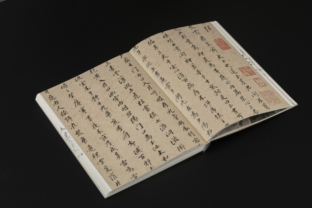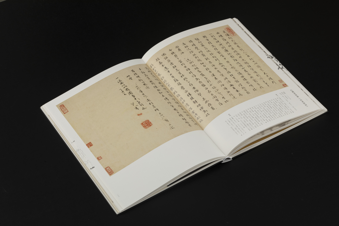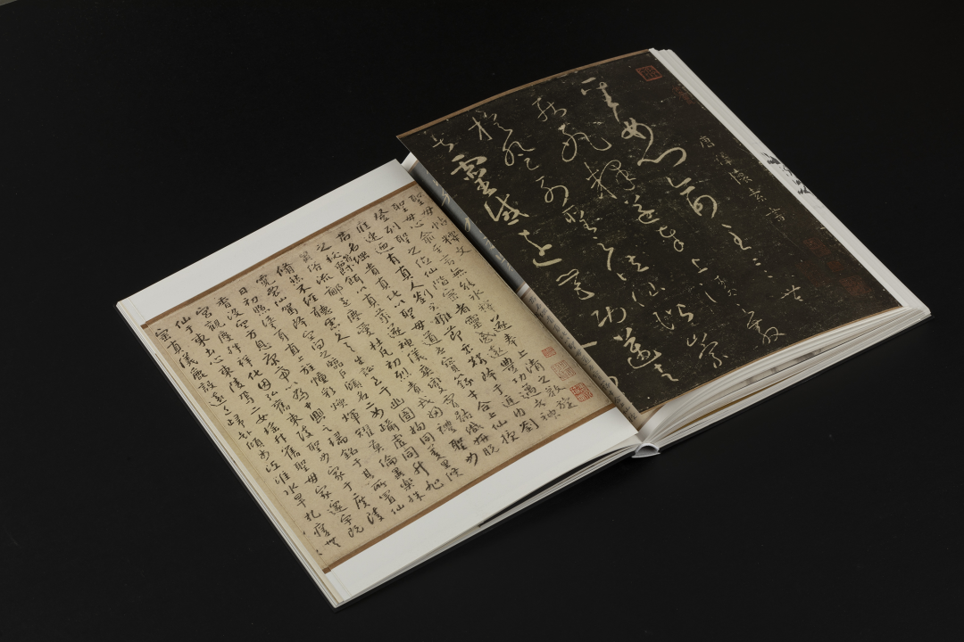 本书的设计初衷是给读者耳目一新但不脱离八大的美学感受。可摊平的法式软精装既有画册的视觉愉悦,又有拿握翻阅的舒适感;跨页、拉页、折页,原大、放大都尽情展示八大艺术高峰的精彩时刻。书口,这里我们做了一个有“心意”的设计:顺翻是八大的画像,逆翻是八大的签名。比如《(传)宋拓怀素草书〈圣母帖〉并八大山人行楷书释文题跋》。它是一个长卷,在设计上做了四开拉页的呈现。再如《兴福寺半截碑》,装帧上做了一个原大的设计。希望能让读者朋友能够更加真实的感受到作品的气息。这一手《兴福寺半截碑》在装订的时候要手工锁线。因为原大尺寸是小于书籍尺寸的,在纸张克数选择、页数装订、与书籍整体厚度考量上都花了很多的精力。终于较好还原作品的原貌。经过多种材质的打样,总共有两个版本,精装本与特装本。八大山人笔下的荷花清朗萧逸,极能彰显其艺术特色,故而在精装本设计中,特选取荷枝作为封面元素来开启八大山人的艺术世界。法式软精装带来良好的阅读体验,而对传统中式书装中的签条予以加宽,以及使用传统中式典雅配色,则在增强设计动感的同时,强调了中式书装的美学理念。
